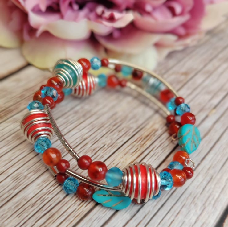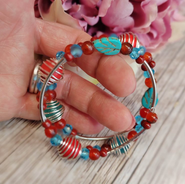 Handmade bracelet with 6mm red agate, 4mm glass beads, howlite leaves, 5x6mm crystal rondelles, metal tubular beads combied with 10mm caged beads.