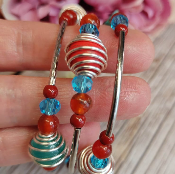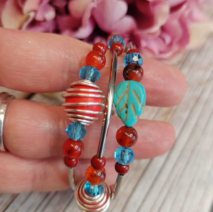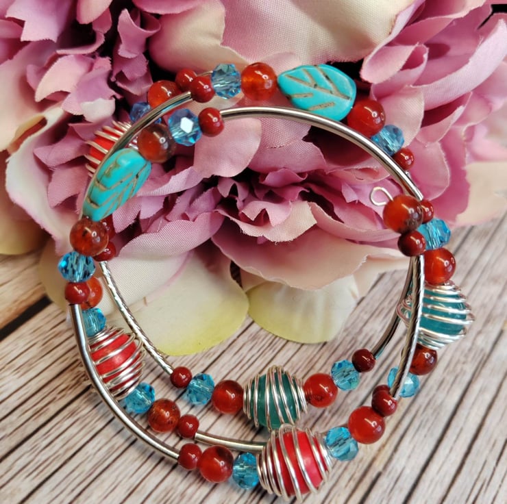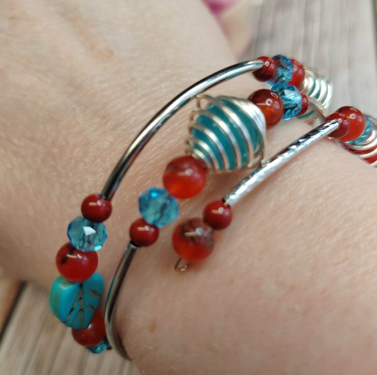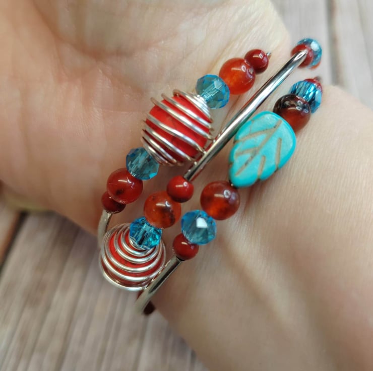 The caged beads have been wire wrapped by hand using .8mm wire wrapping red magnesite 10mm beads and blue quartzite 10mm beads.