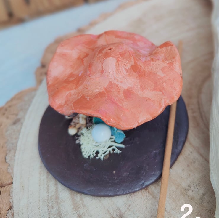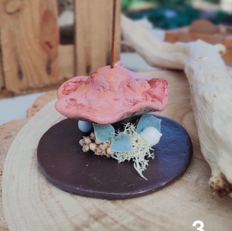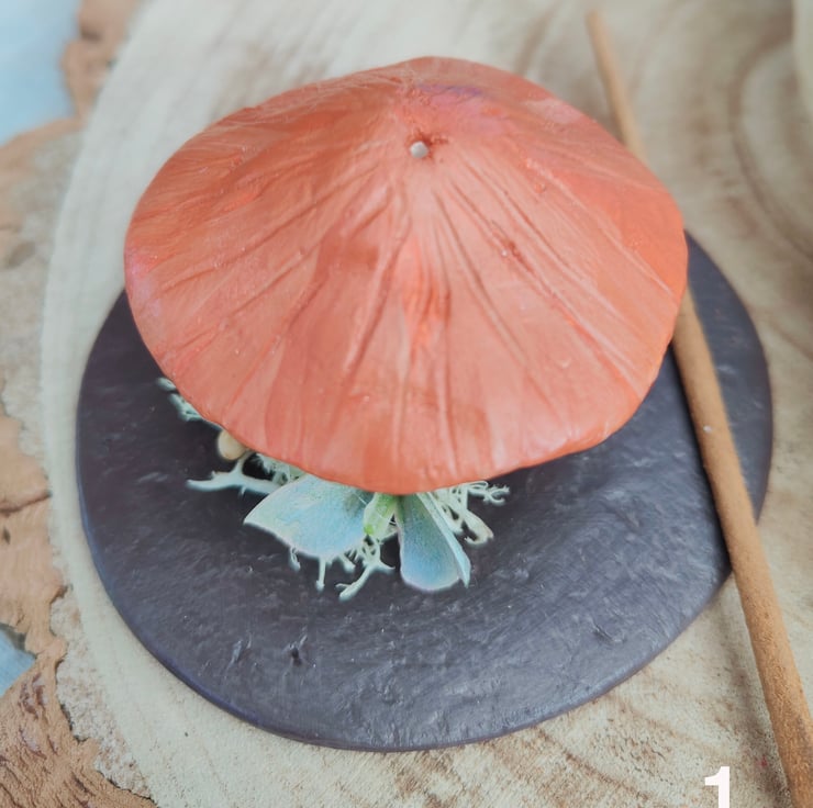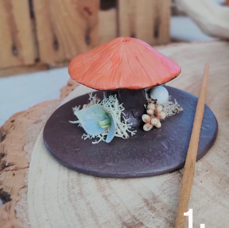 Mushroom incense holders made from clay. Each one is hand painted and varnished, and sits on a flat base decorated with miniature dried flowers.