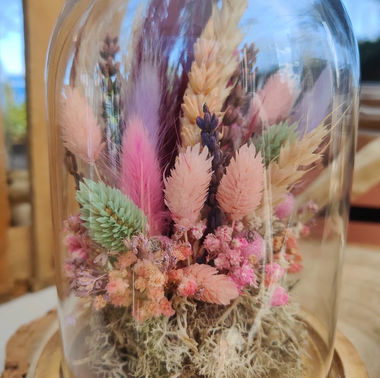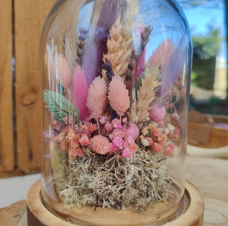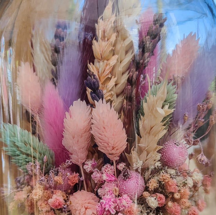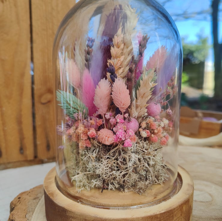 Medium glass dome/cloche filled with an arrangement of dried flowers in bright pastel colours including pink, purple, lilac, and blue. The dome sits on a thick, natural wood base and is sealed in place.