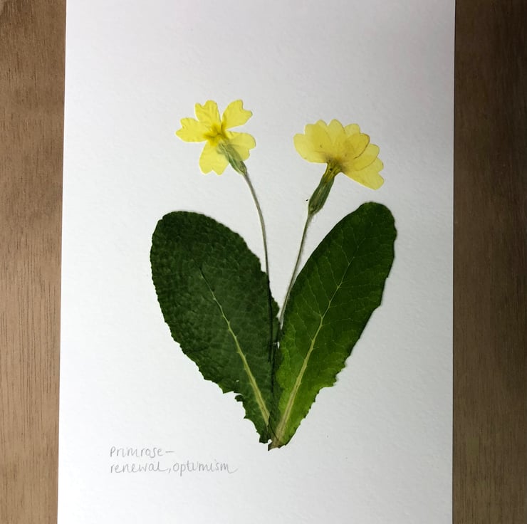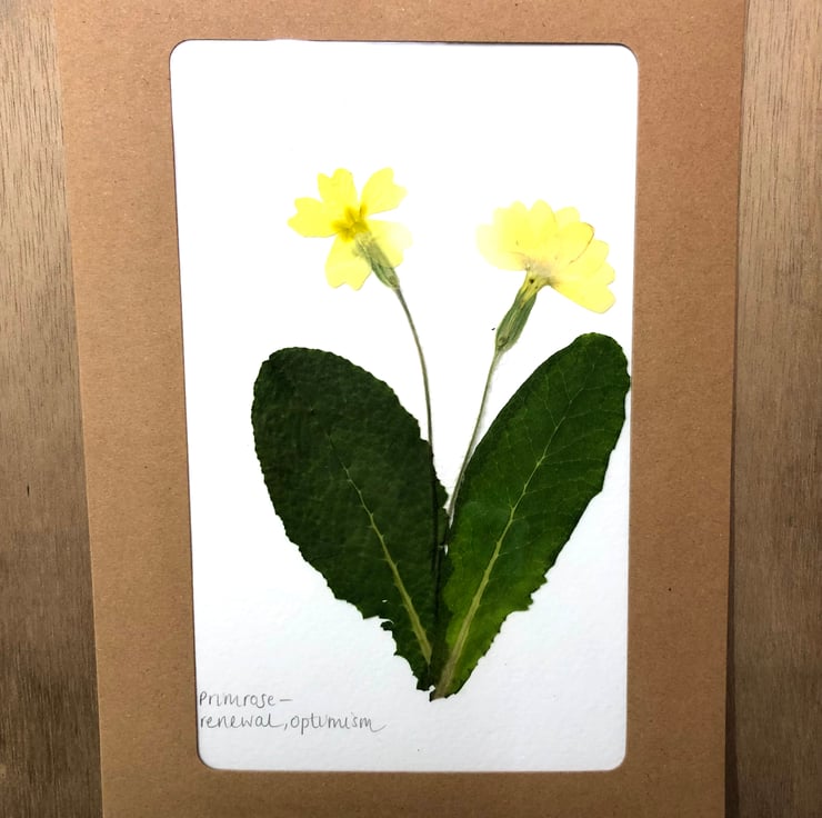 They are mounted on white paper, annotated with the name of the plant and its meaning, and then packaged in a manilla envelope with a window to view the flower inside.