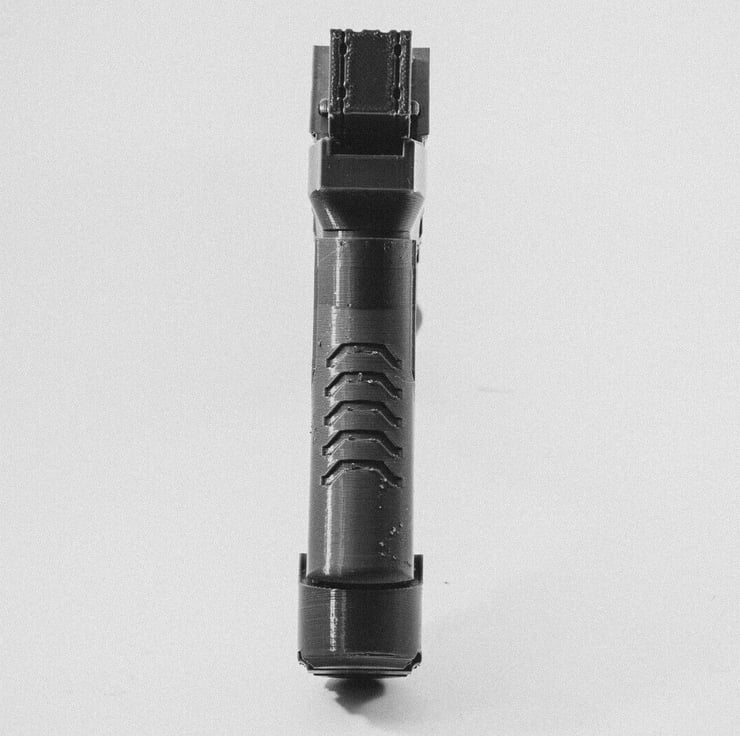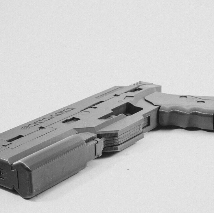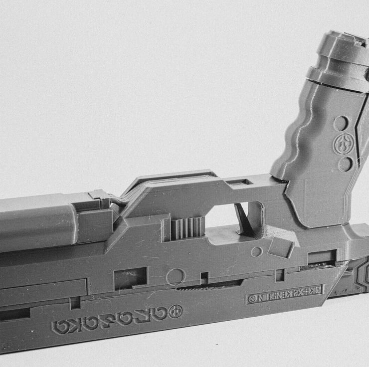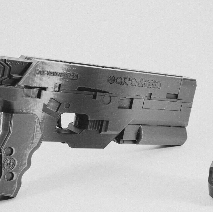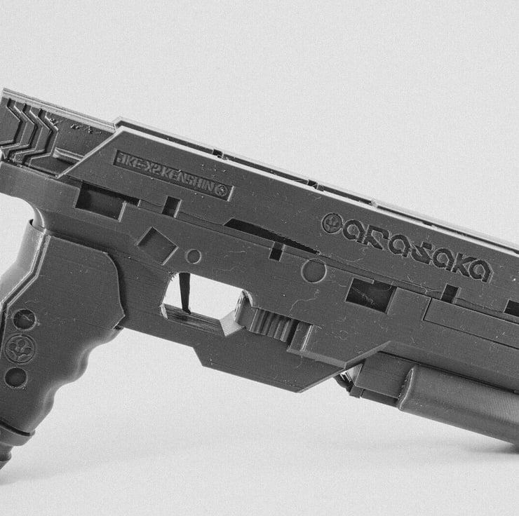An unofficial 1:1 scale replica of Arisaka Kenshin tesch pistol, from the Cyberpunk 2077 video game, complete with removable magazine.