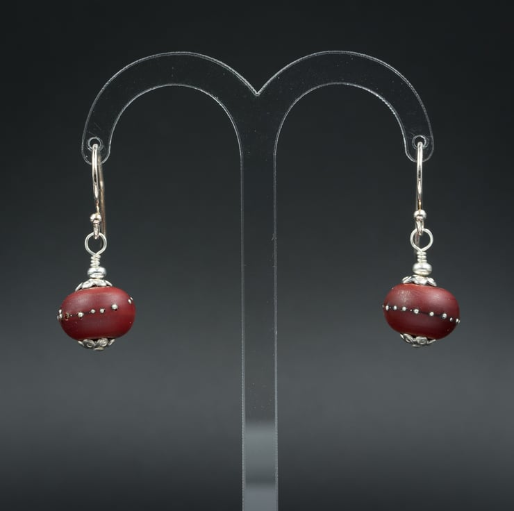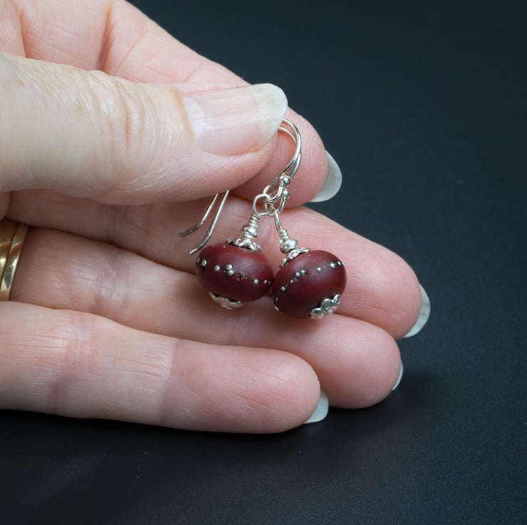 A gorgeous pair of deep red lamp work glass beads with fine silver dots handmade for me by a local glass artist.