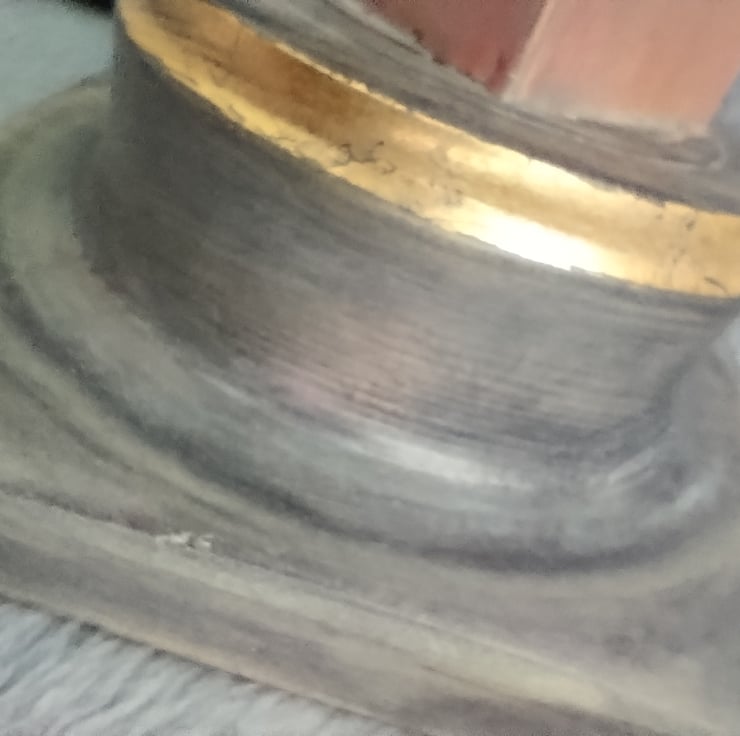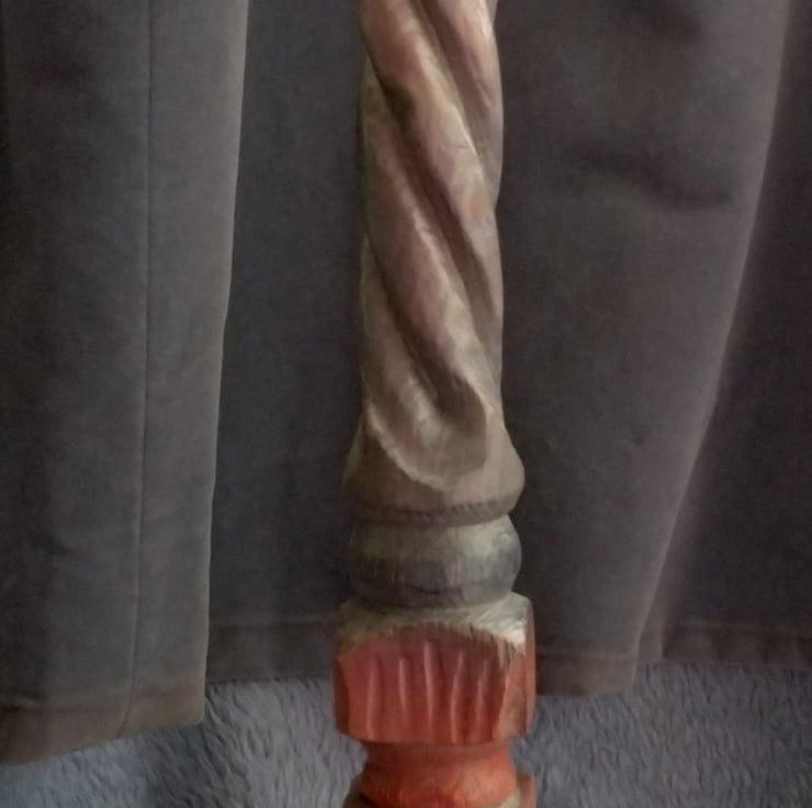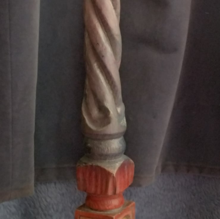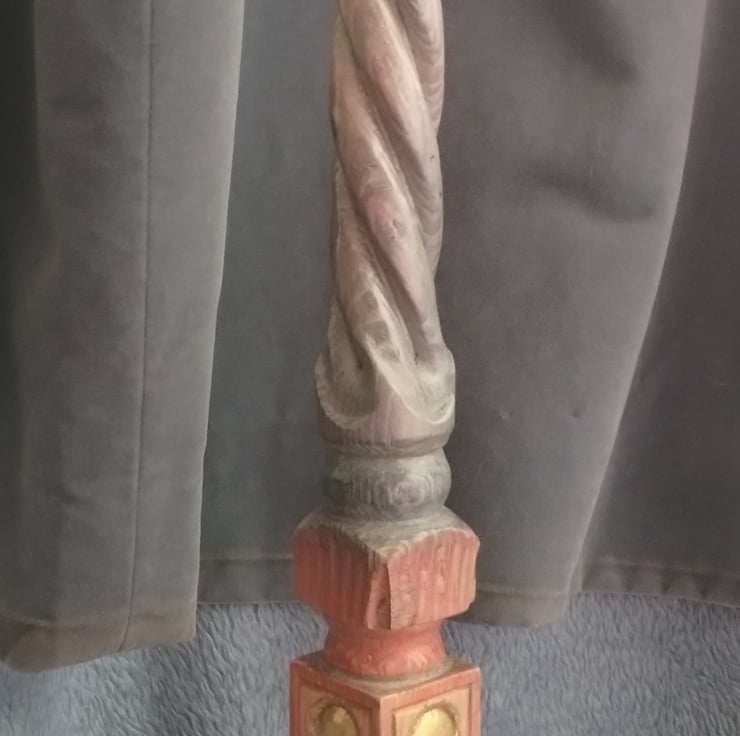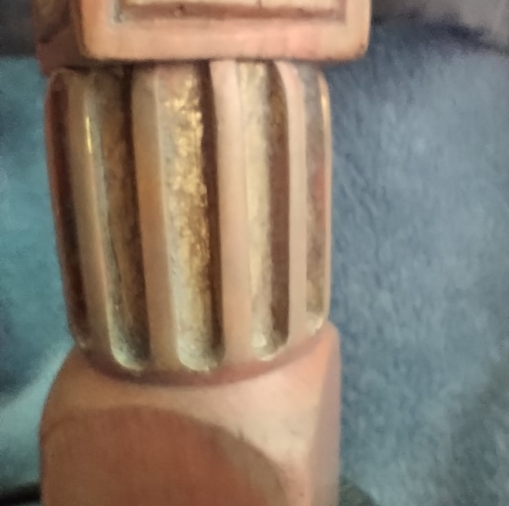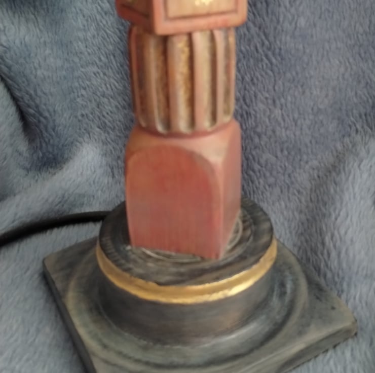 One of a series of table lamps from a while ago when I was looking at ornamental turning. This naturally lead to using spirit stain to allow the wood grain to show through, then is seemed obvious to apply some gold leaf to highlight as well as some coloured wax after. It is second hand, as I used it for a few months....very pleased with it... but I have so many now I need to let some go to a new discerning owner... as I am not an electrician I will remove the plug and the new owner will need to get a competent person to check the electrics before they reattach it:- if you think about it I am sure you will agree.... the bulb and the shade are not included either. Btw, the top is slightly bent when you look at it from one angle, I think the wood has bowed slightly, such is life with wood... there is steel tube running through the middle with the cable inside...so should be fine....