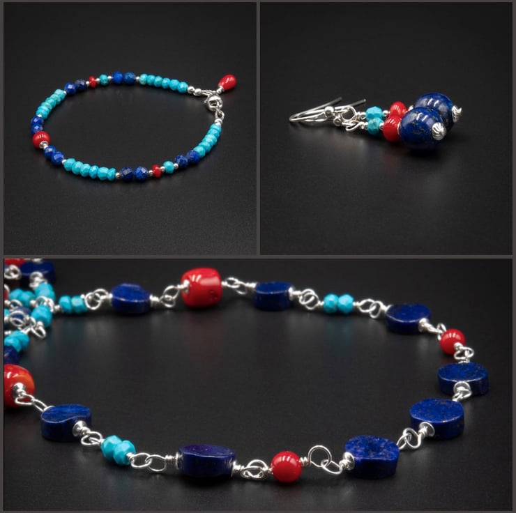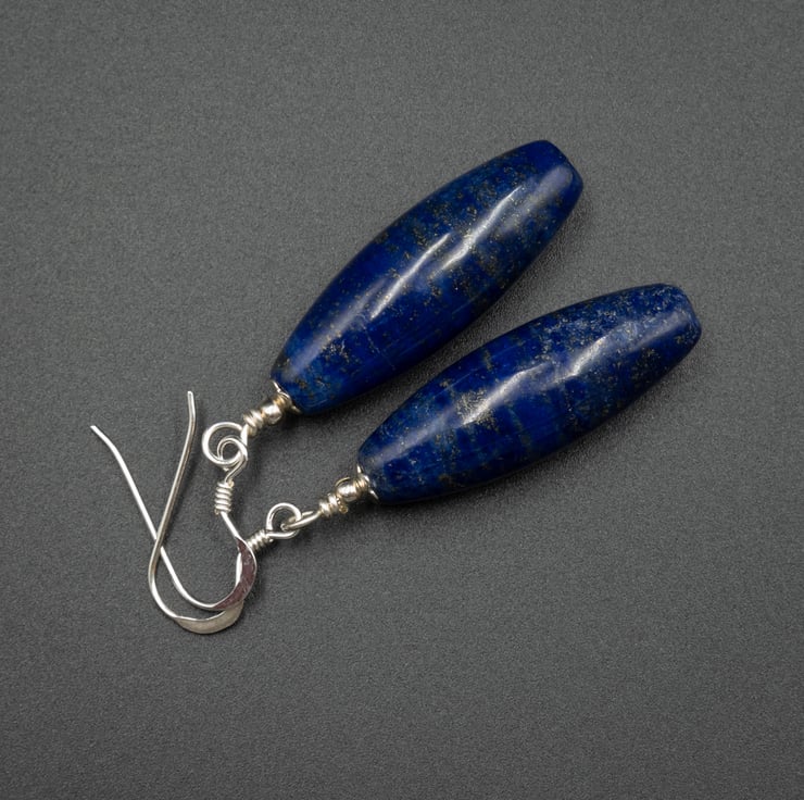 Lapis lazuli 10 x 30mm long barrel beads are accented with silver plated beads frame for these striking drop earring.