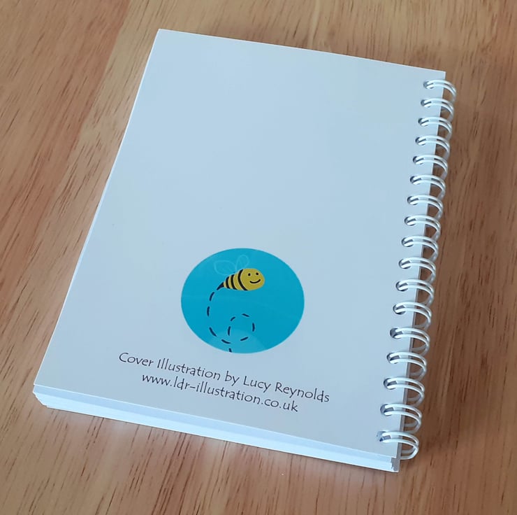 The front cover features my 'Rainbow Bees' illustration and has a white wire binding. I painted the original illustration digitally.