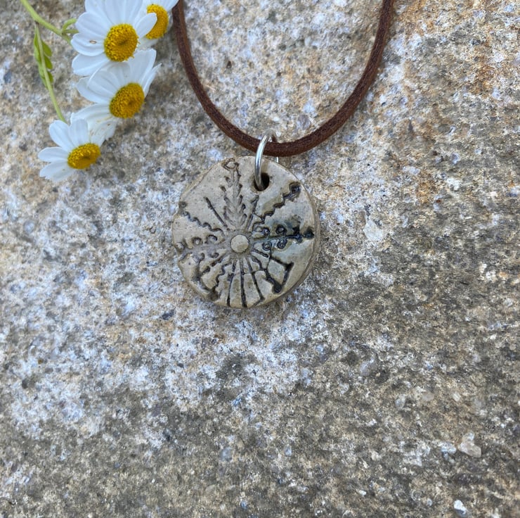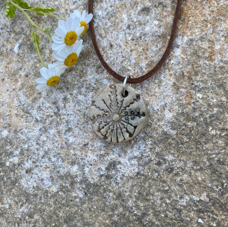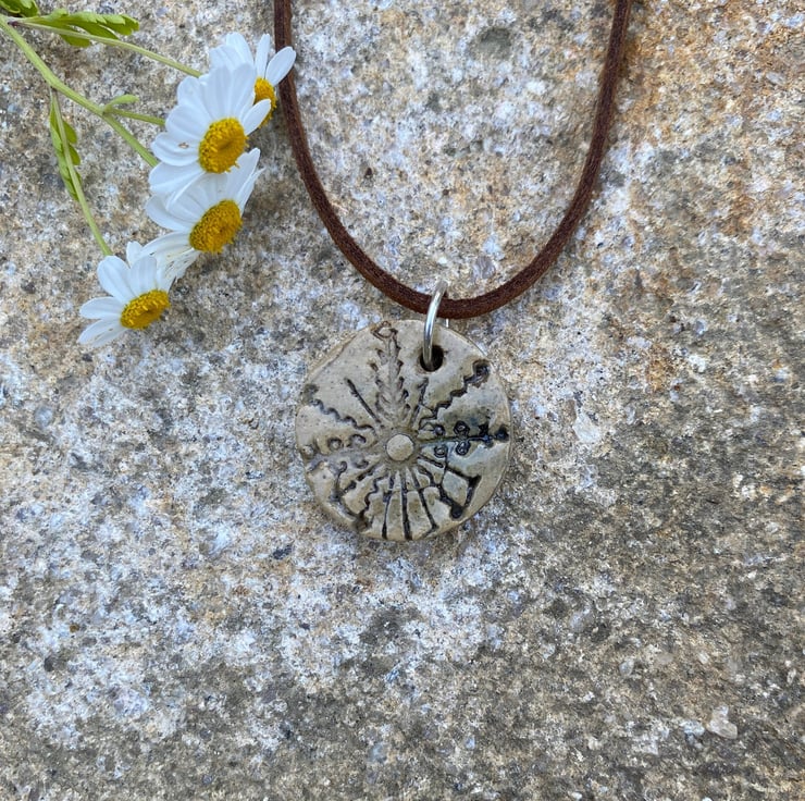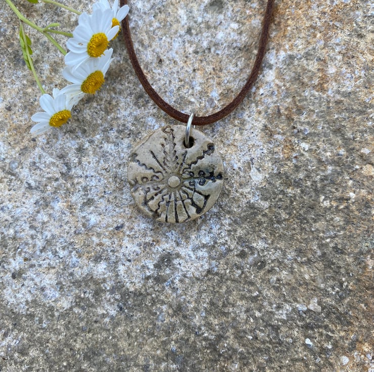 Hand-made and hand-painted ceramic pendant with geometric pattern.