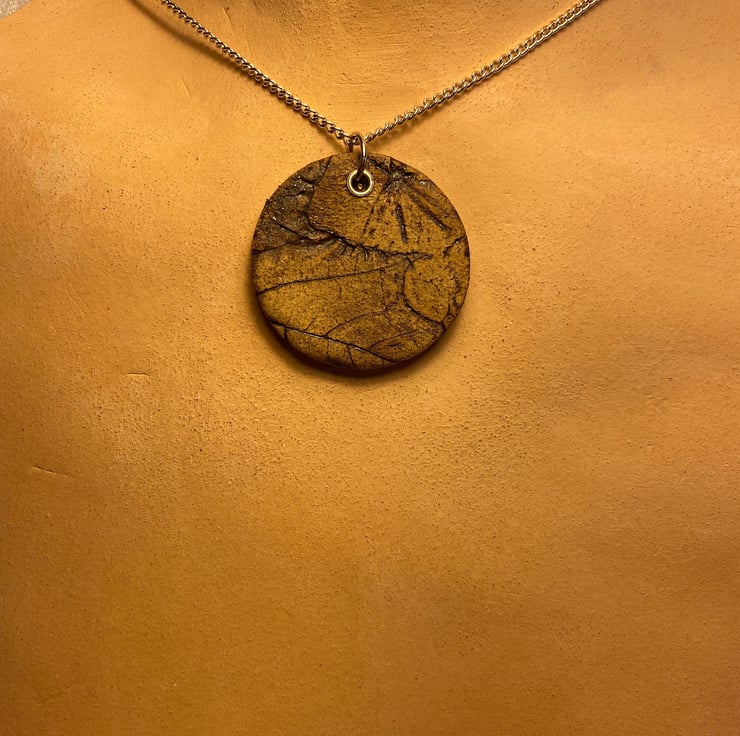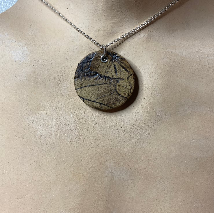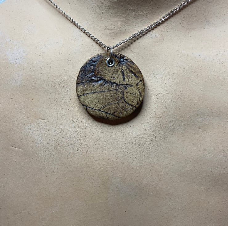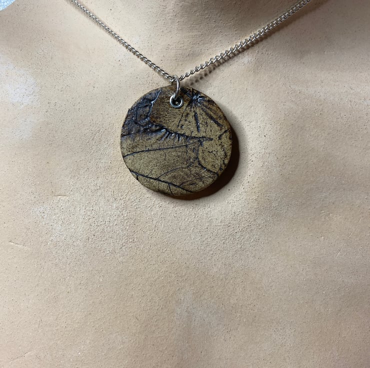 Ceramic pendant with geranium leaf impression. The geranium symbolises happiness, good health, good wishes, and friendship. They are associated with positive emotions.
