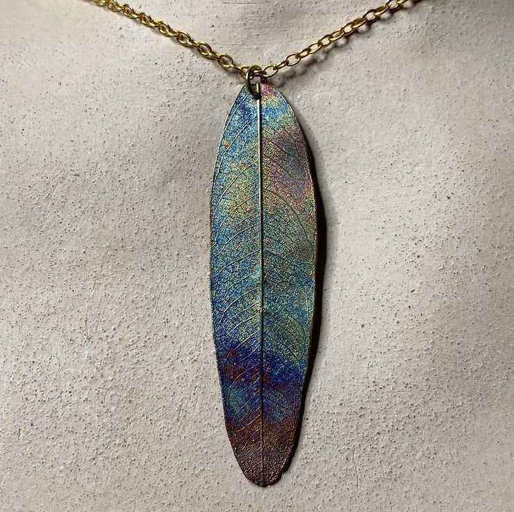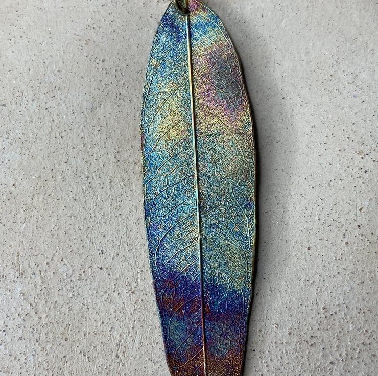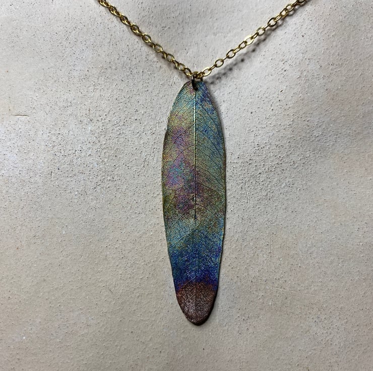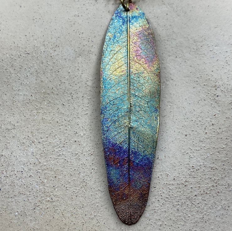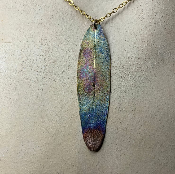 leaf pendant, real skeleton leaf, copper rainbow patina.