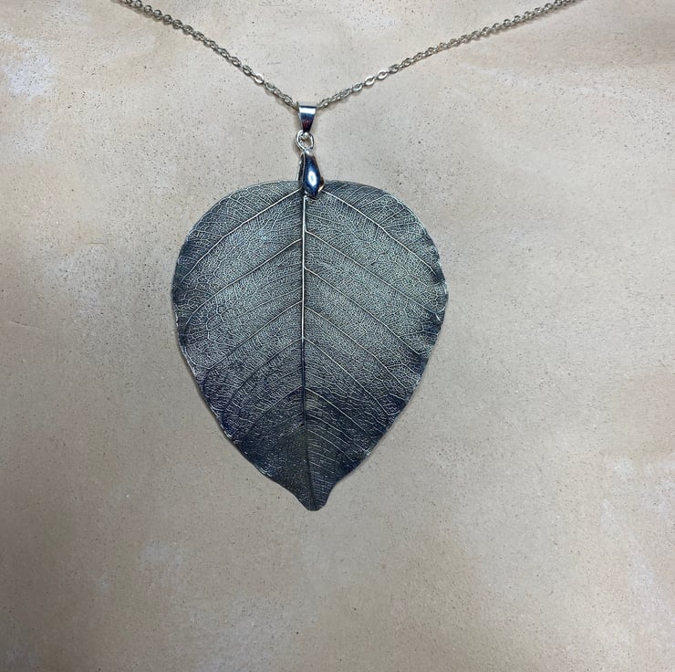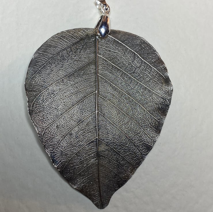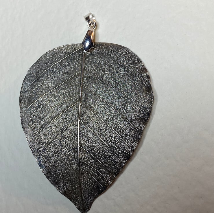 Heart-shaped bodhi leaf pendant. The Bodhi leaf pendant is electroformed in silver. It is a beautiful heart-shaped skeleton leaf that comes from the Bodhi tree - the tree under which the Lord Buddha was sitting when he attained enlightenment. Bodhi (Pli and Sanskrit for "enlightenment")