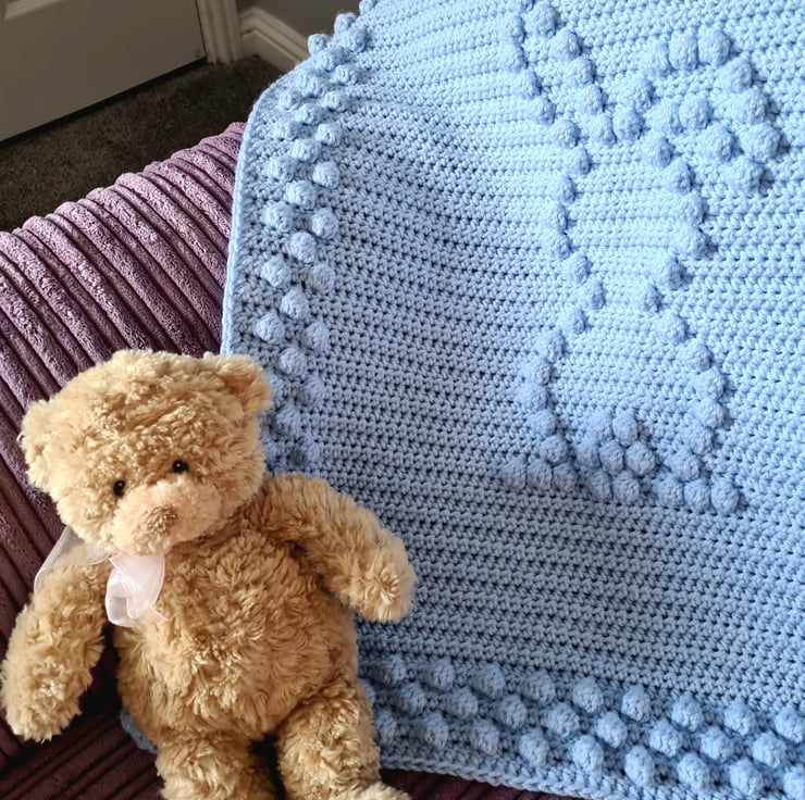 Beautiful handmade bobble crochet baby blanket, pushchair size with a lovely bunny design in a lovely baby blue colour. Can also be ordered in other colours, most available. Send me a message to request a custom order
