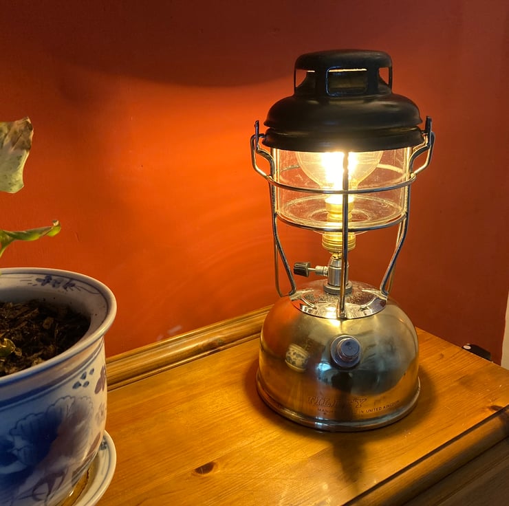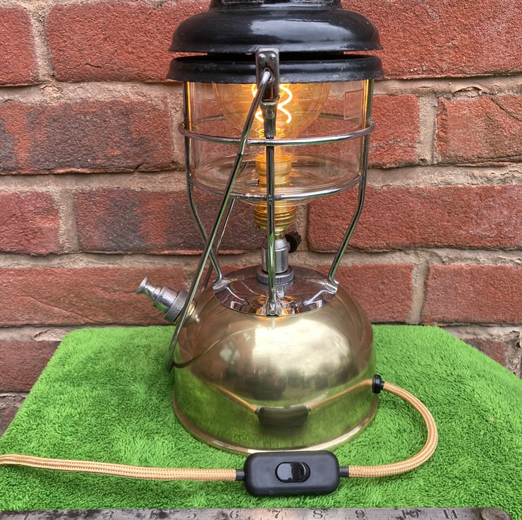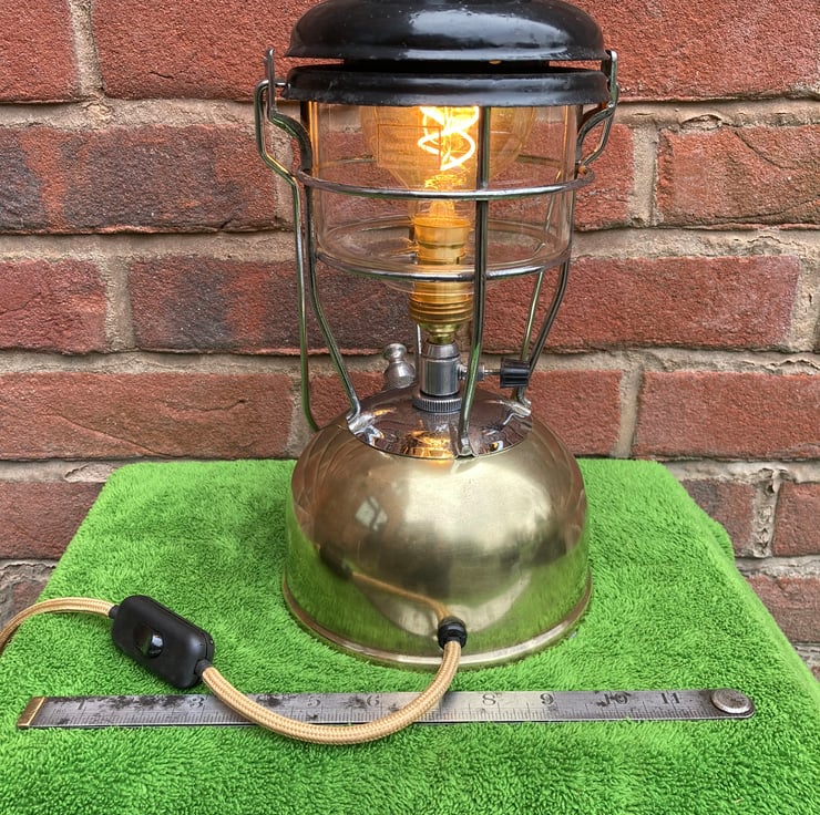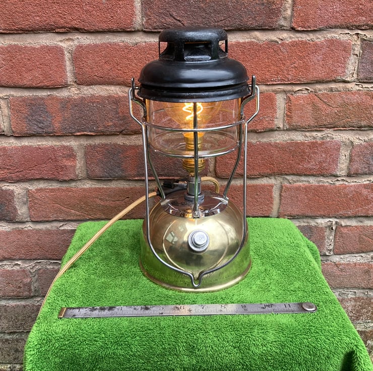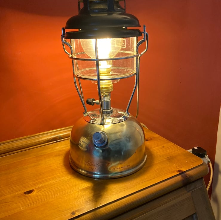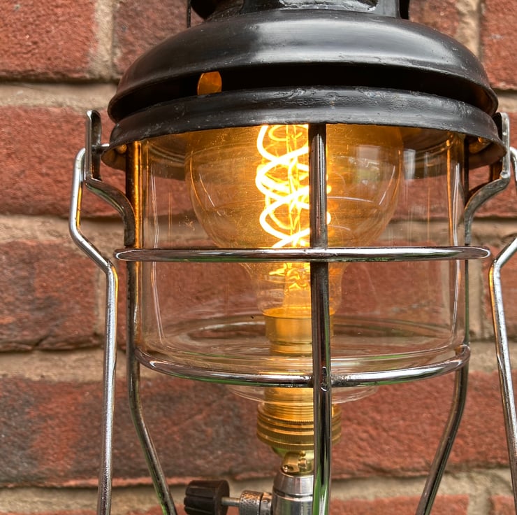 A vintage Tilley X246-B paraffin lamp, expertly converted to mains electrical operation using new electrical components, retaining the look and feel of the original. A brass BC lampholder is fitted onto the original valve to hold a warm white G80 spiral filament LED bulb where the original mantle would have been.