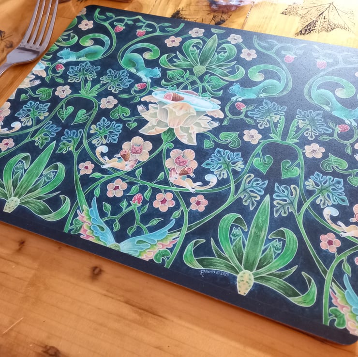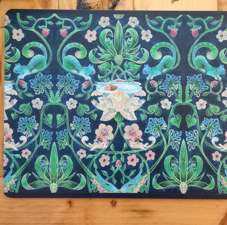 A beautiful placemat, professionally printed with one of Field and Fabric's art designs of cheeky cats pinching ham. Inspired by William Morris' "Strawberry Thief" design, there are repeating motifs of foliage and flowers, amongst which cats are hidden (some more than others!), some of whom have stealthily acquired some ham which does not belong to them! Cork backed and made from wipe-clean material.