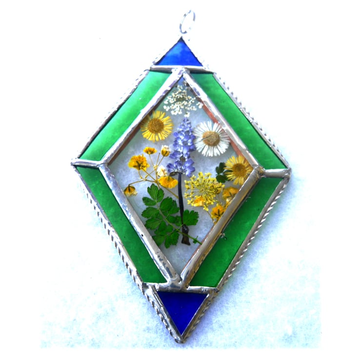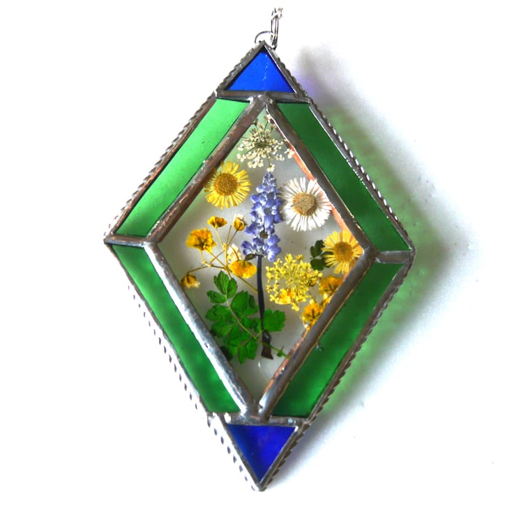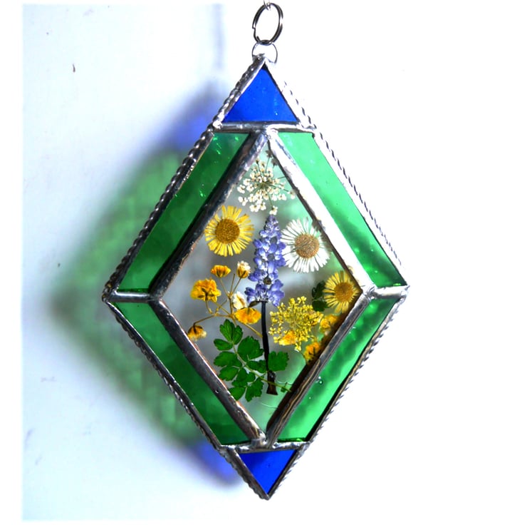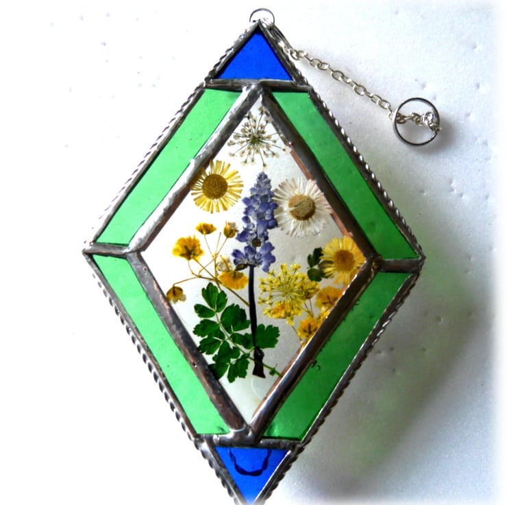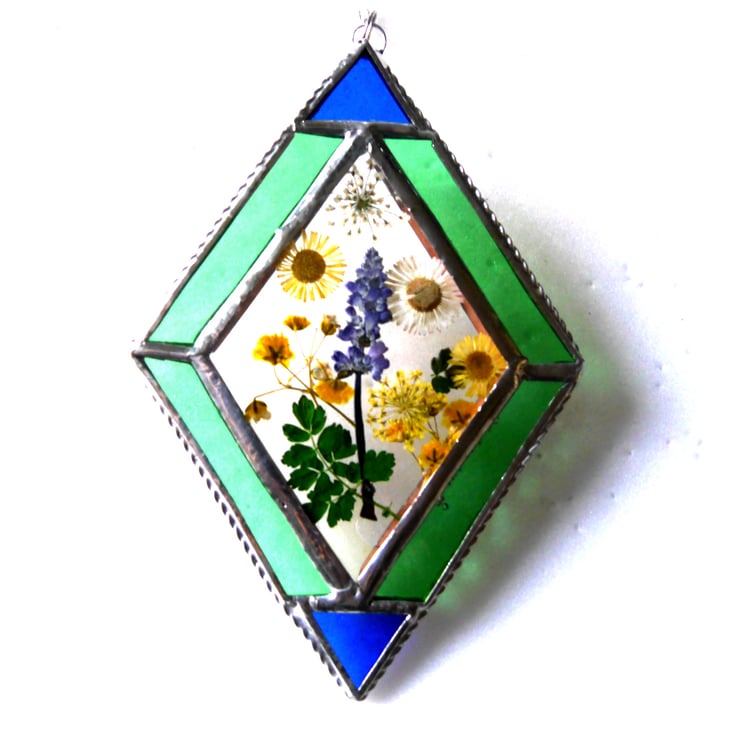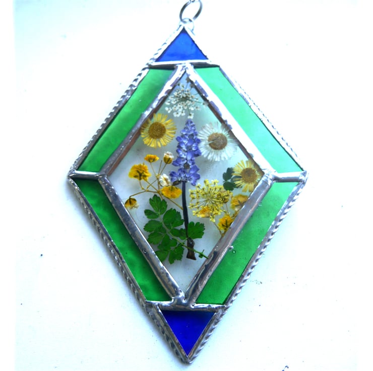 A stained glass hanging decoration entirely handmade by me using the Tiffany copper foil technique and incorporating pressed flowers.