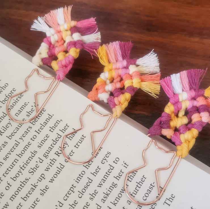 Set of 3 bookmarks on jumbo rose gold paperclips with shape of a cat.
