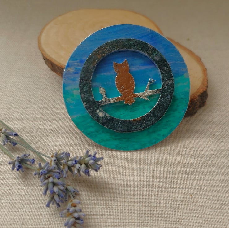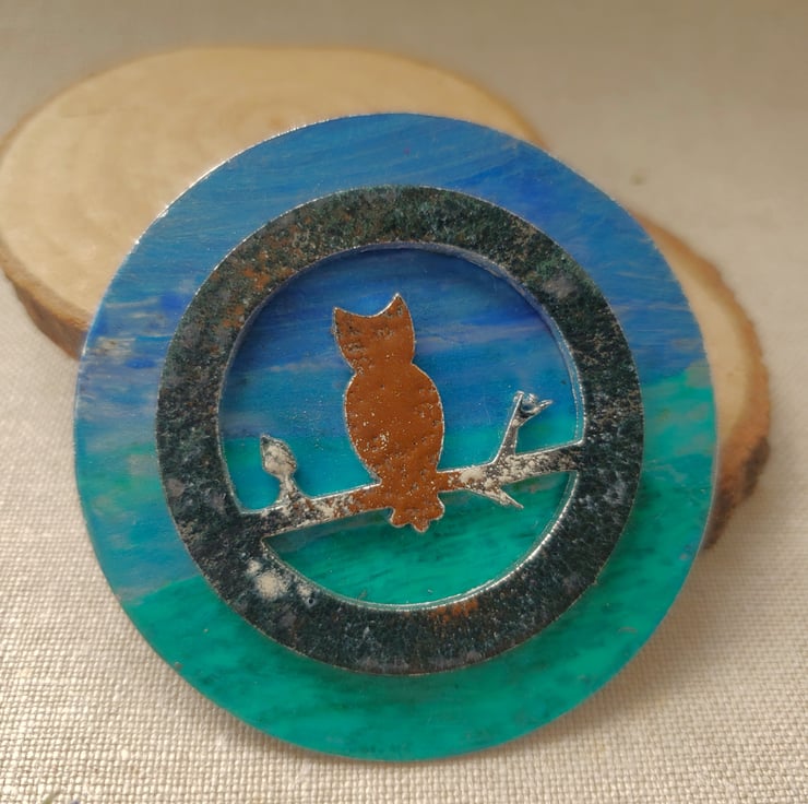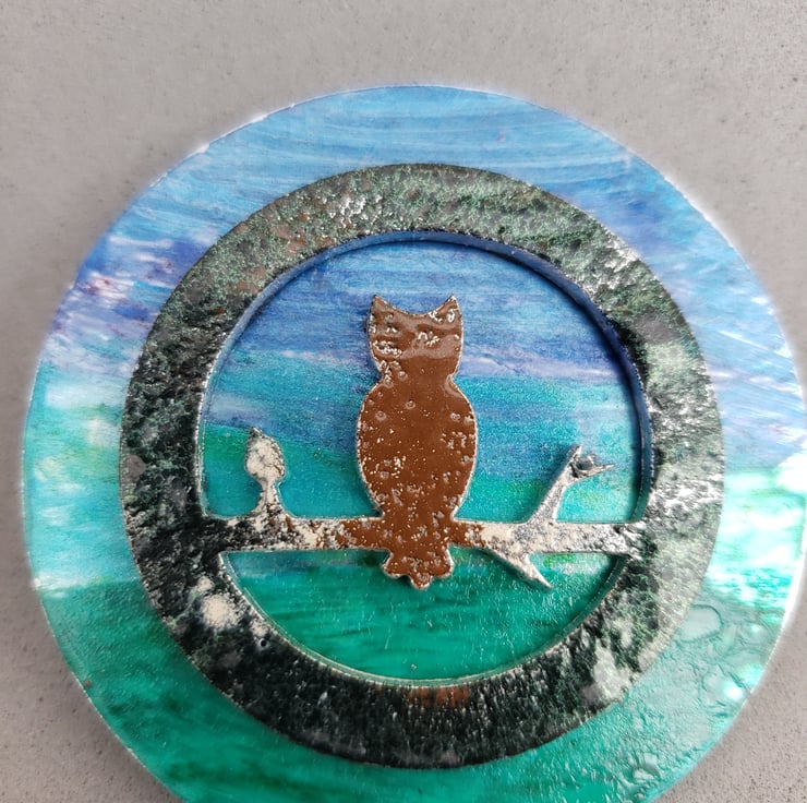A repurposed stainless steel blank of an owl has been cleaned then enamelled in different colours. I've then attached this to the stainless steel blank which has been coloured with inks and acrylics. A unique gift for nature lovers.