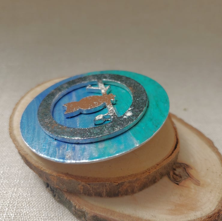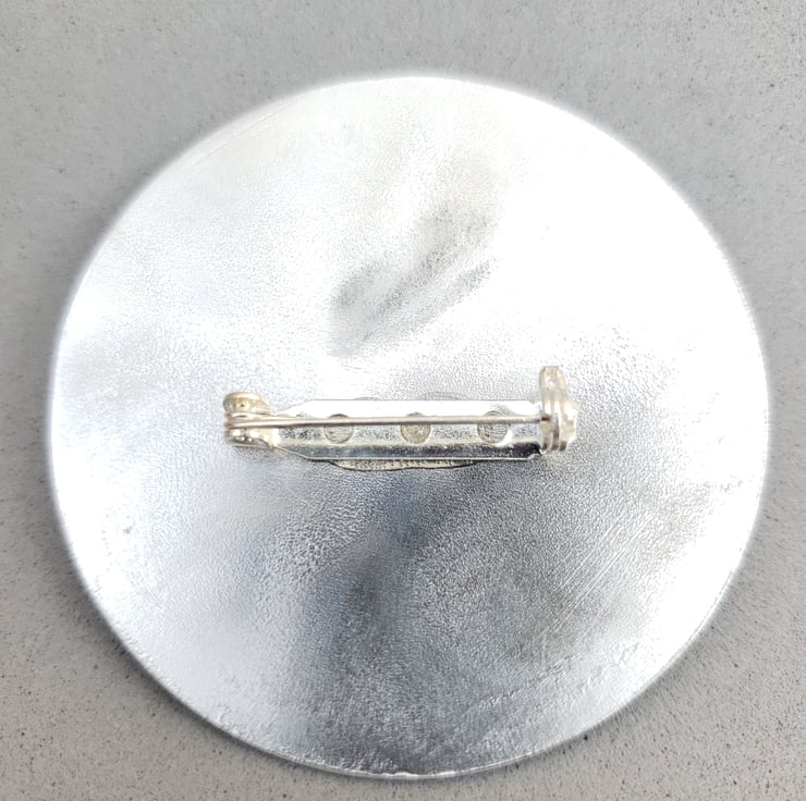 Because of the different mediums used the finish to the face of the brooch is uneven but I think this makes it more interesting. The back has been polished and sealed. Each one is totally unique.