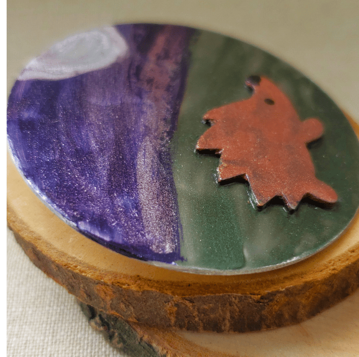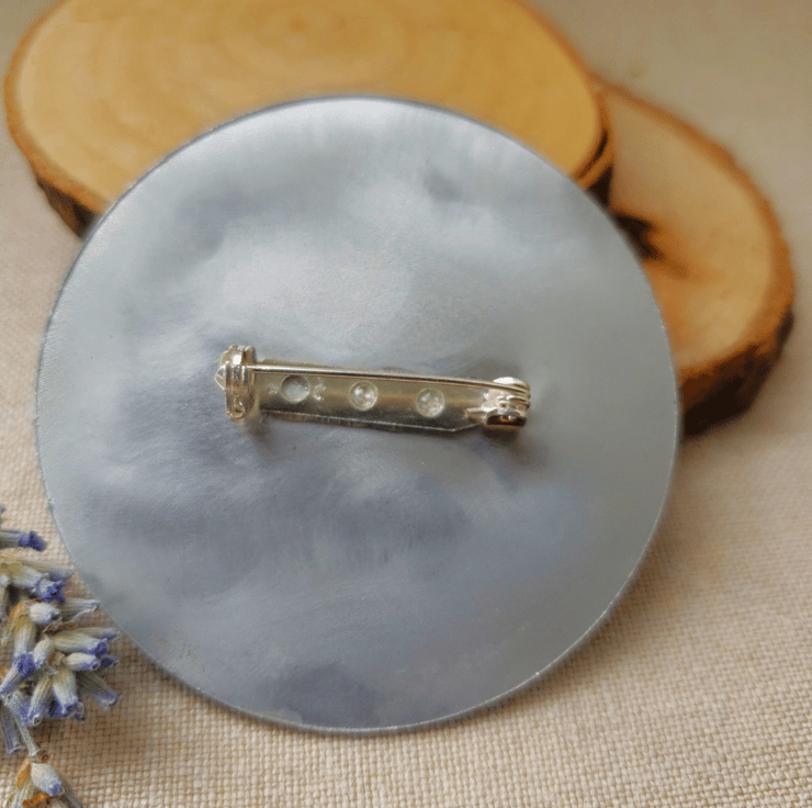 Because of the different mediums used the finish to the face of the brooch is uneven but I think this makes it more interesting. The back has been polished and sealed. Each one is totally unique.