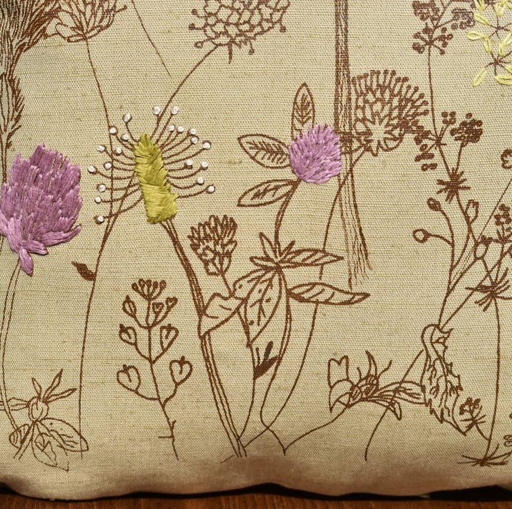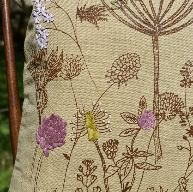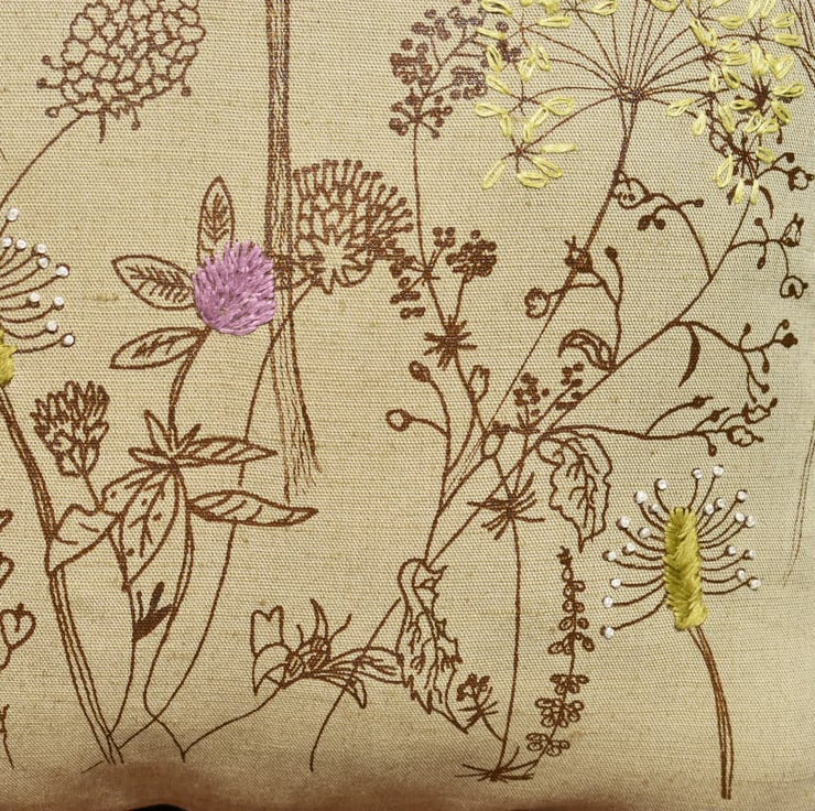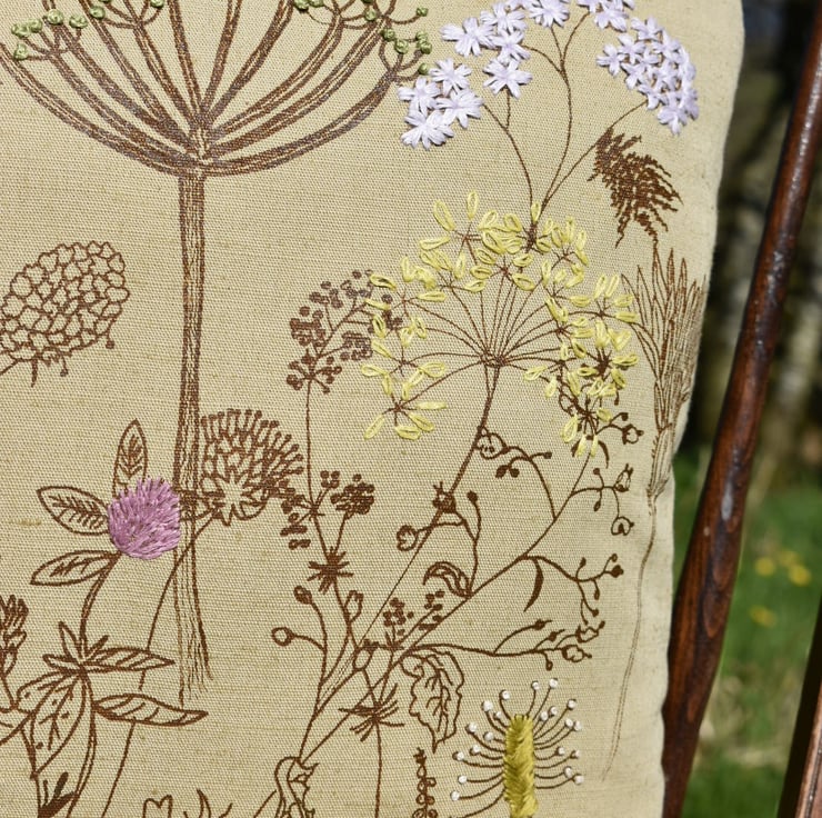 This is a green medium weight linen cushion that has been screen printed with my own designs. Many have been individually printed which involves positioning, printing an individual flower, drying and then repeating. This gives you an absolutely one off, designed cushion. Many of the flowers are then hand embroidered to lift the petals from the fabric and give a pop of life and colour. There are cow parsley, yarrow and plantain.