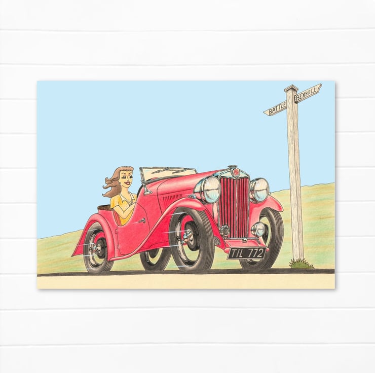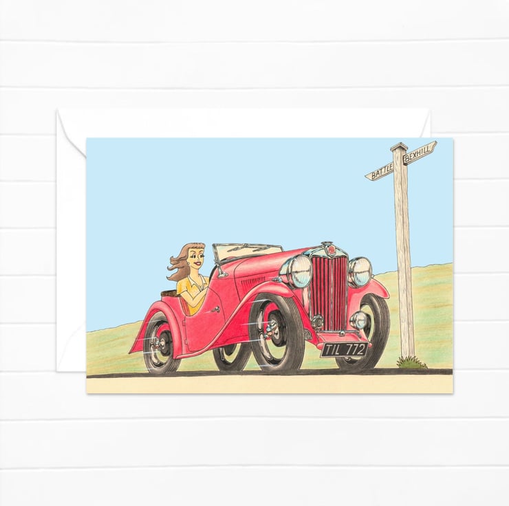 An original art greeting card featuring a hand-drawn pencil illustration of a young woman enjoying her drive in a classic forties sports car.