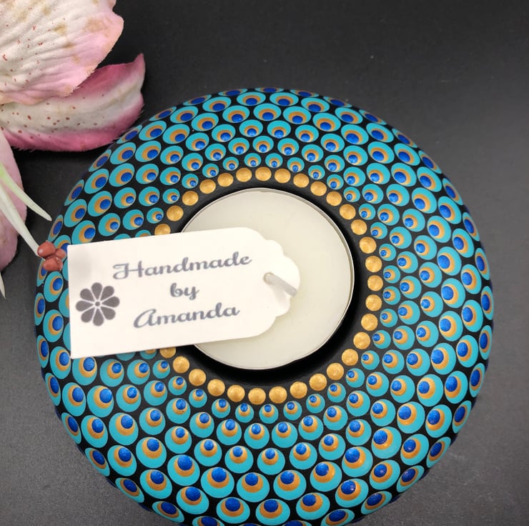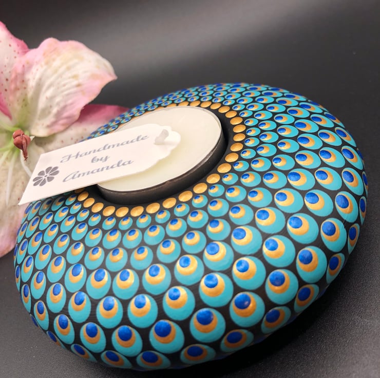 The holder is hand cast by me, before adding a black base coat. The peacock design is then dotted in aqua, gold and metallic ice blue.