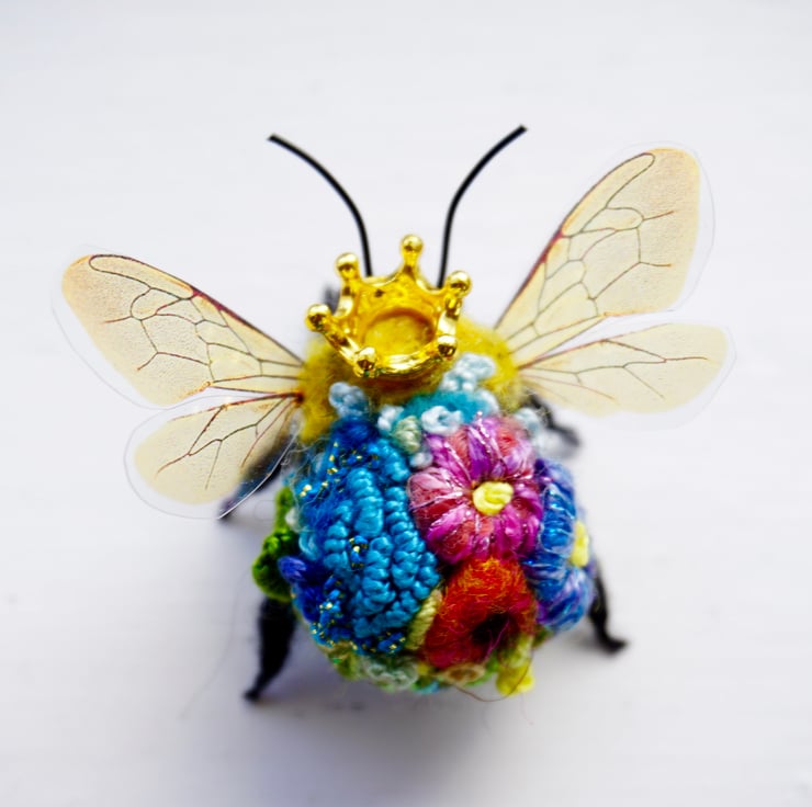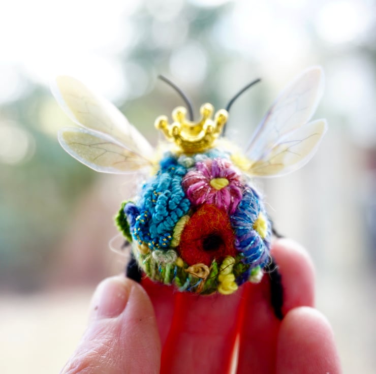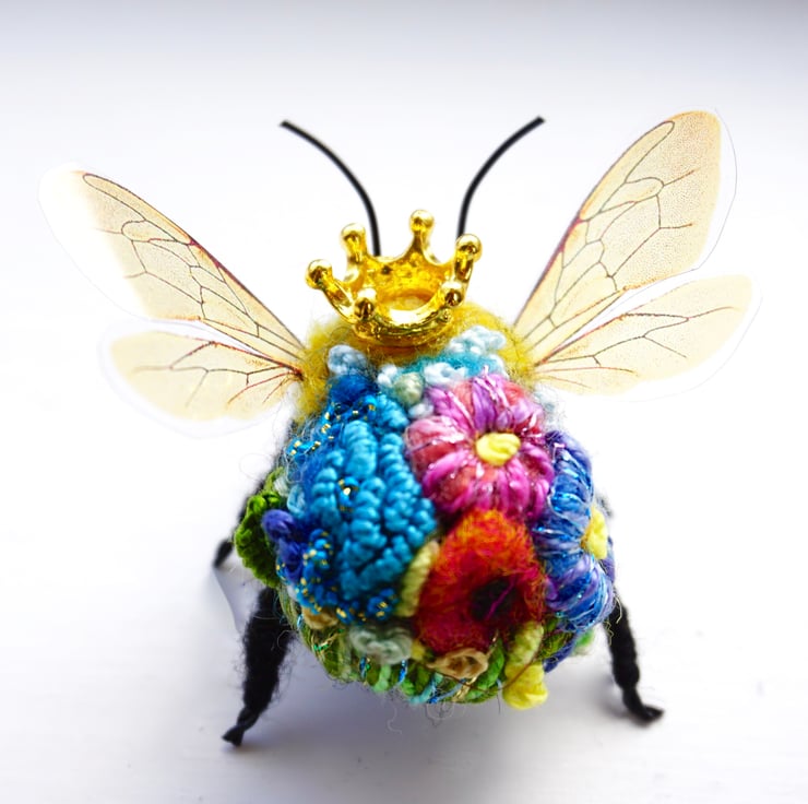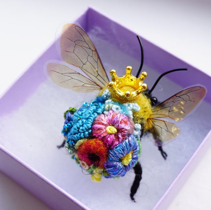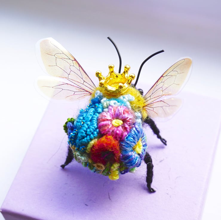 Needle felted and embroidered queenr bee, measures approx 3 cm long by 5cm wide .She has a little crown attached to her head.Your bee will come with a fine gold hanging thread ,which can be snipped off if not required,Gift box included.This is actual bee you can purchase.