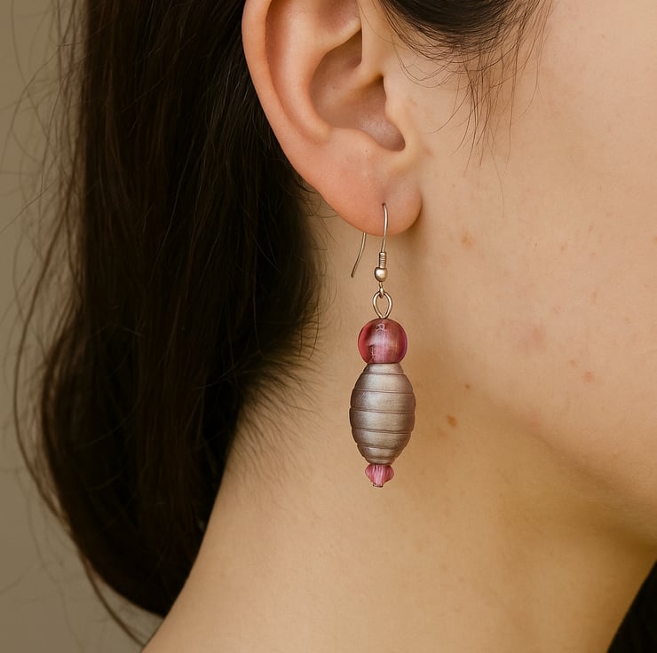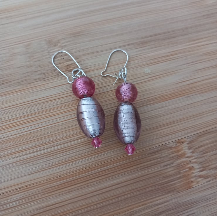 A rose pink ovel glass lampwork bead together with a slightly darker round glass lampwork bead. The earring drop is approximately 2.5 cm and the earwire is silver plated. The earrings will come to you in an organza gift bag. Gjft boxss can be puchased separately.