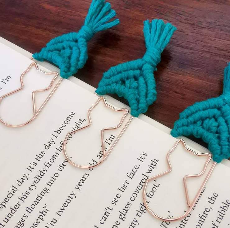Set of 3 bookmarks on jumbo rose gold paperclips with shape of a cat.