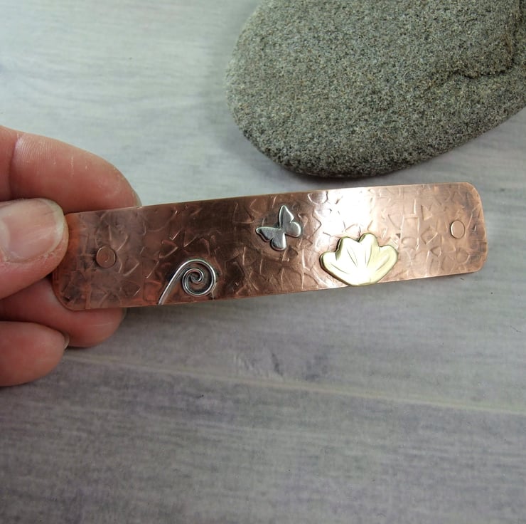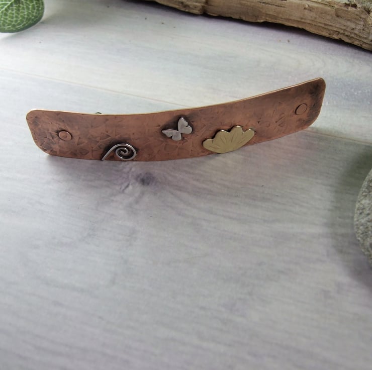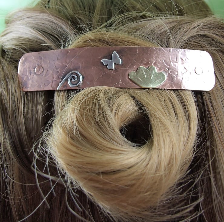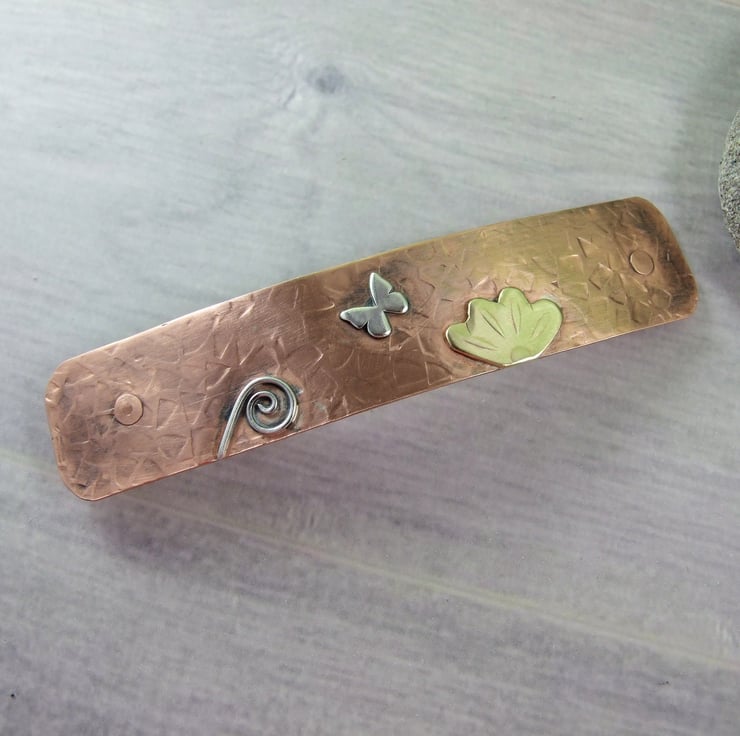 I created the barrette base using copper sheet, which I have cut by hand then embossed with a texture pattern. To the front I have added a little scroll and a butterfly in contrasting white metal and a brass flower also cut from sheet metal and embossed with a petal design, all soldered securely in place. I have fitted this to a purpose bought 2.5 steel spring clip with copper rivets.