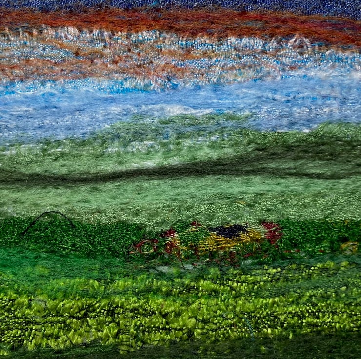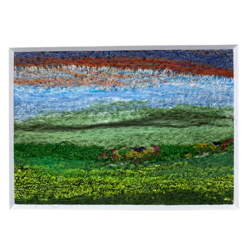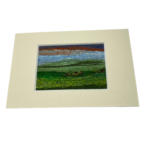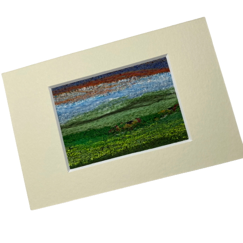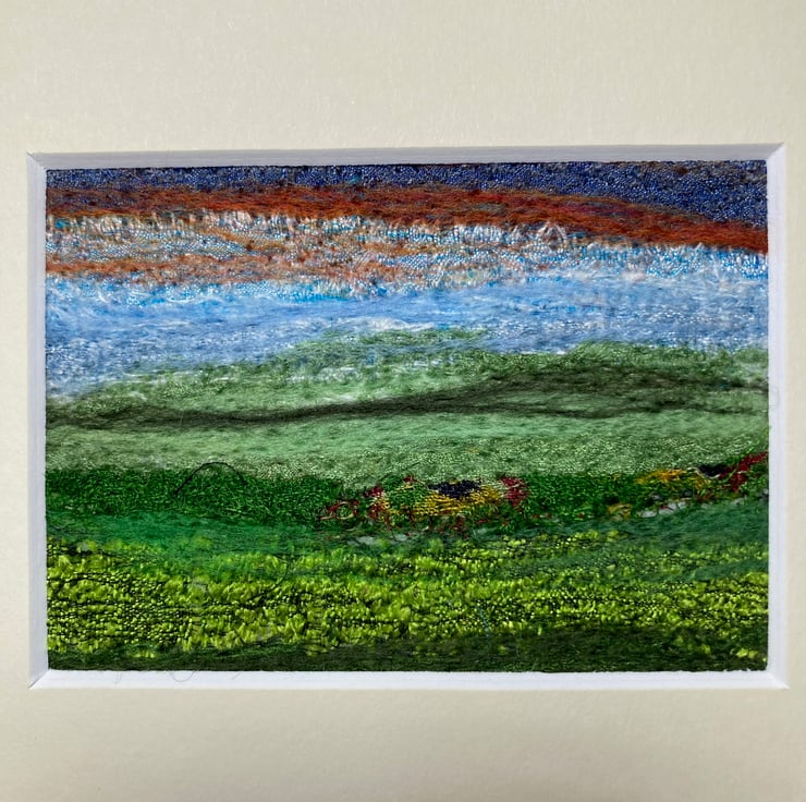A miniature, collectable piece of textile art of a sunset scene. This ACEO has been created using silk fabric and wool and silk fibres. Strips of coloured silk fabric have been used to create the picture with wool and silk fibres used to blend the colours and add detail and texture. The fabric and fibres have been assembled using a needle felting technique which binds them all together without the need for stitching and adds a lovely texture to the picture surface.