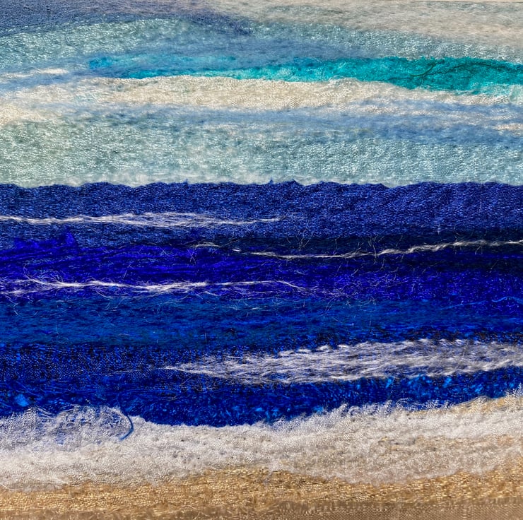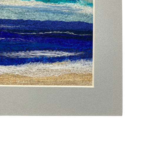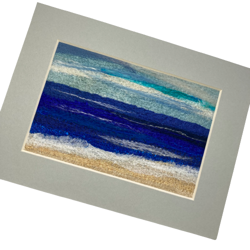 This beach scene is a piece of textile art created using coloured silk fabric and wool and silk fibres. Strips of silk fabric have been needle felted to a felt base with additional wool and silk fibres added to the surface to blend the colours together and add texture. Using a needle felting process binds the fibres and fabric together without the need for stitching. It also adds texture to the surface of the picture. The picture has been mounted on a standard a piece of 6"x4" card and is supplied with a grey 8" x 6" card mount ready to be framed. It is signed on the reverse.