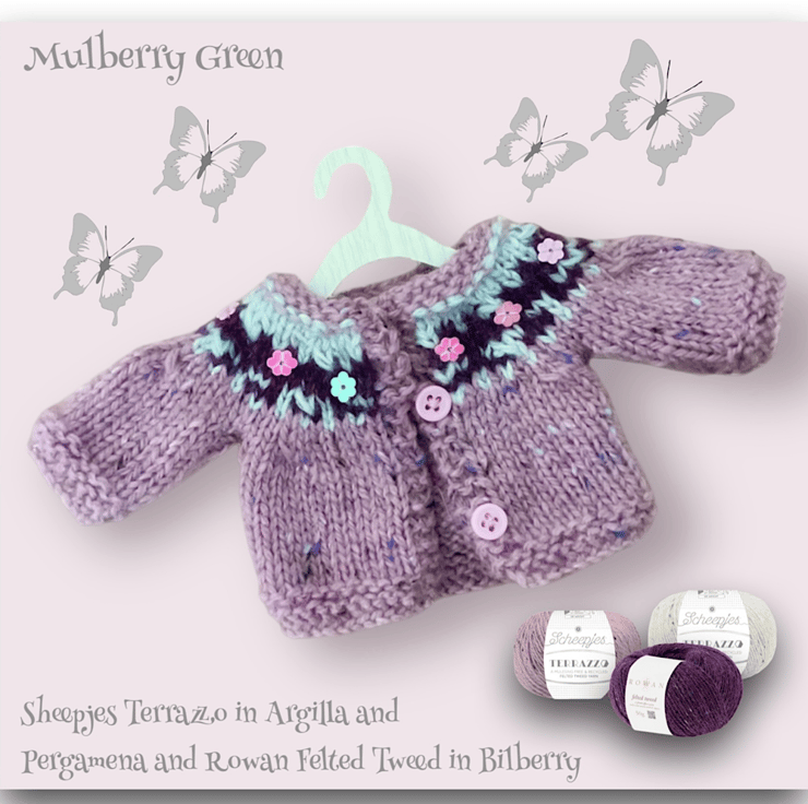 A lovely little cardigan, with a patterned yoke, in Sheepjes Terrazzo Felted tweed, to fit the Mulberry Green characters.