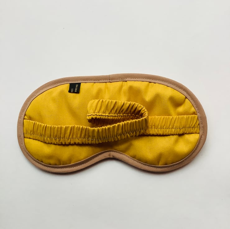 The eye mask has a covered elasticated strap, it is lined with 100% soft cotton, filled with padding made of 100% cotton and finished with the 100% cotton bias-binding tape.
