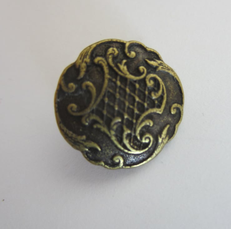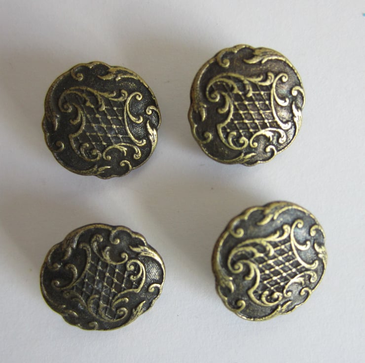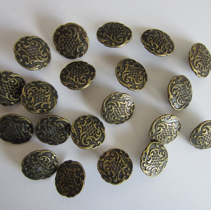 20 metal buttons with pattern. Probably brass, but definitely brass coloured.