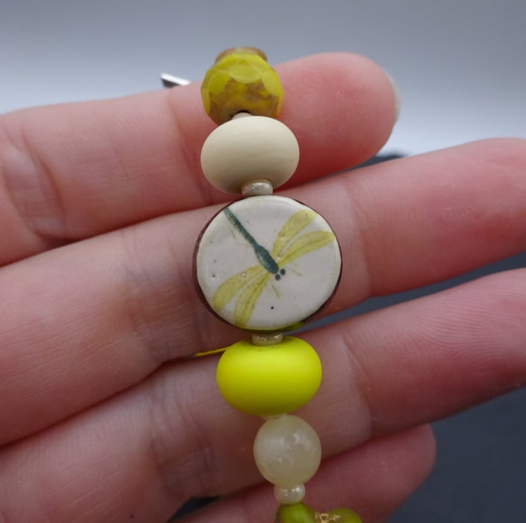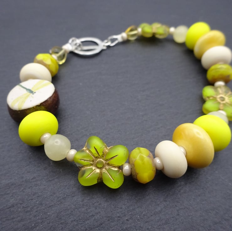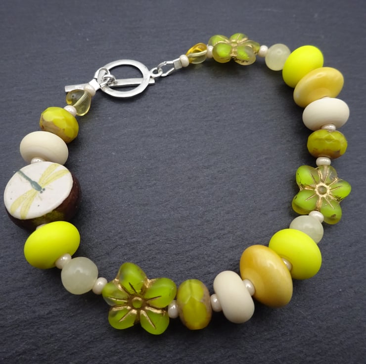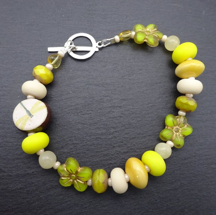 A bracelet made using handmade lampwork glass beads, a handmade ceramic dragonfly bead and Czech glass beads. The bracelet fastens with a sterling silver toggle fastener.