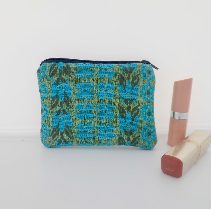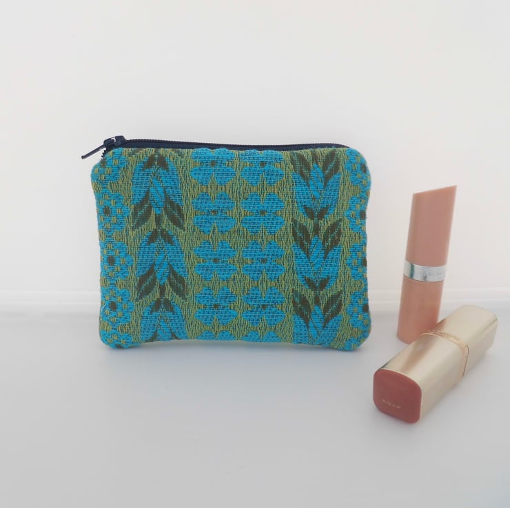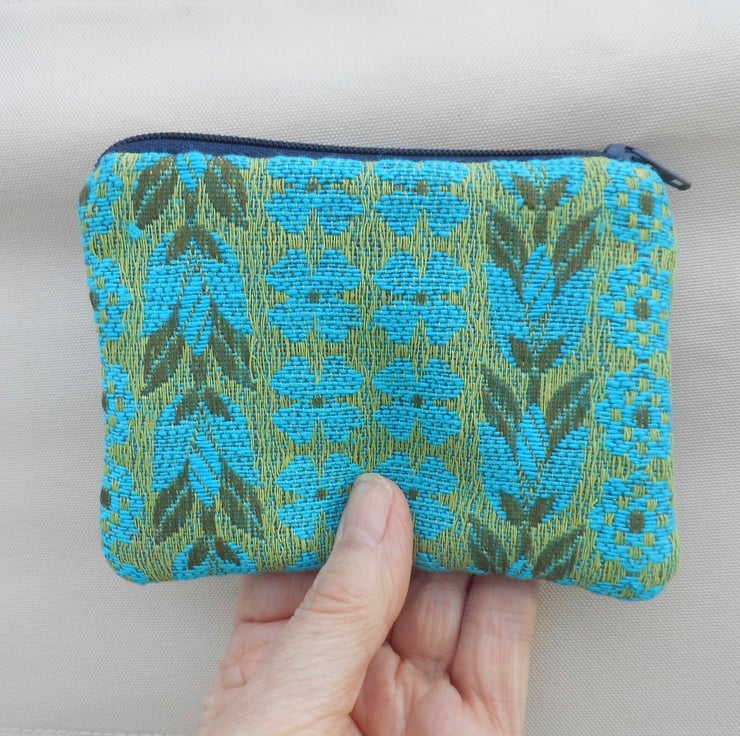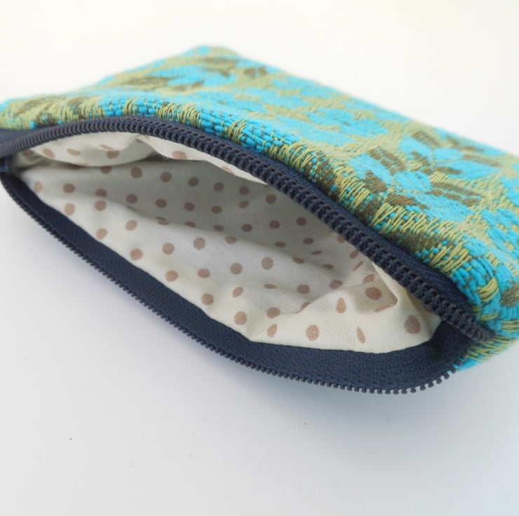 For this coin pure I used a blue and green furnishing fabric with a woven textured floral pattern. Lined with beige and white dotty quilting cotton and interlined with a layer of woollen fabric for softness.