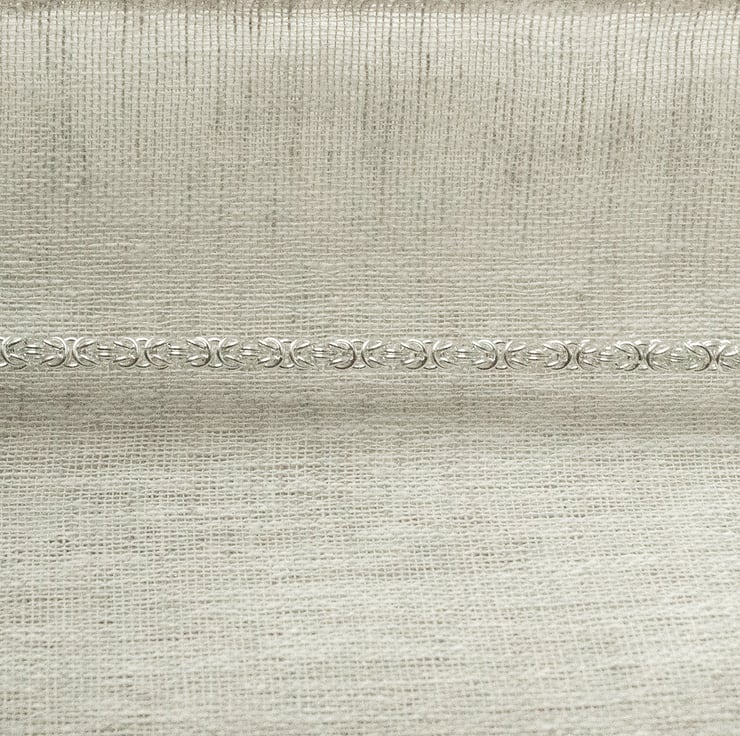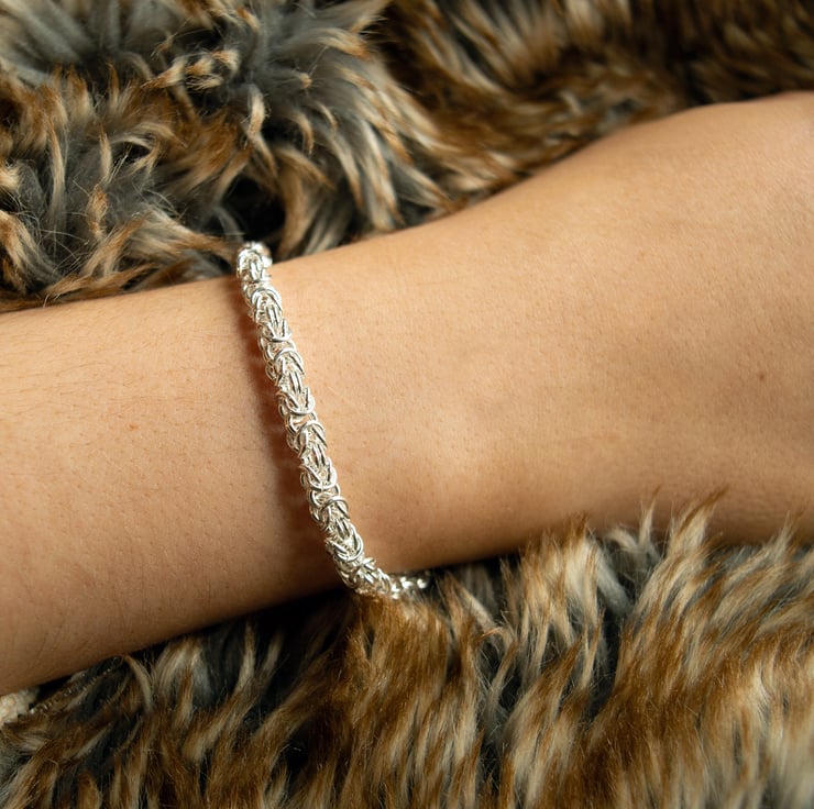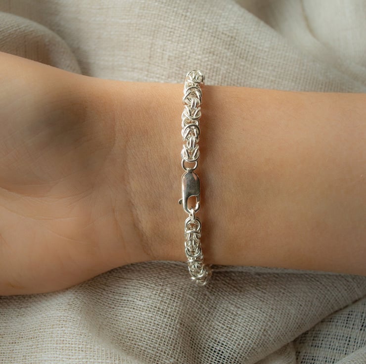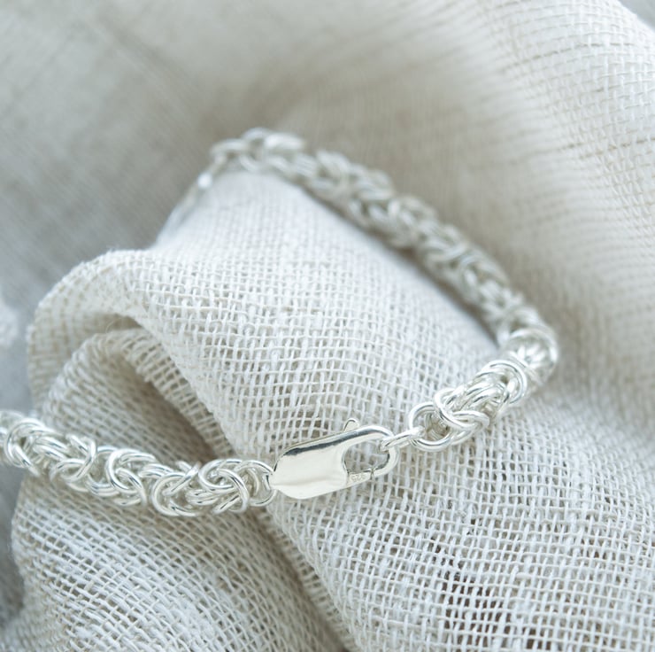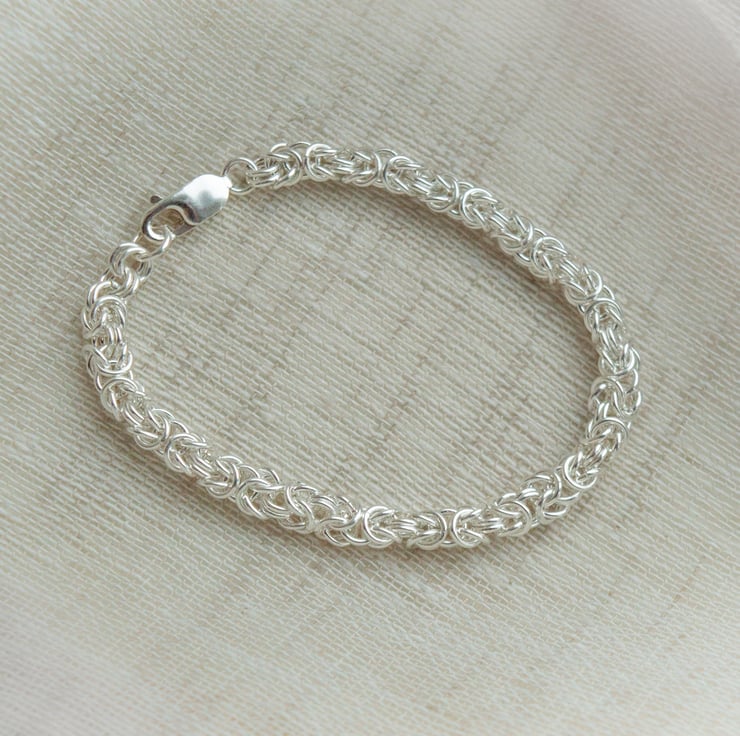 This Sterling Silver bracelet is made by me in a lovely, fluid, Byzantine style link. Handcrafted to a length of your choice in a 5mm width, it is also finished with a sturdy lobster claw clasp