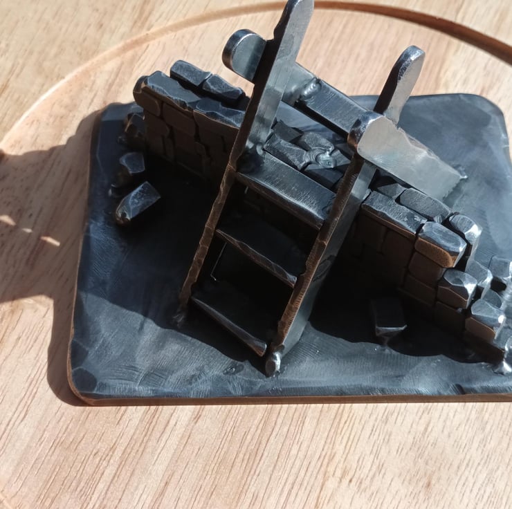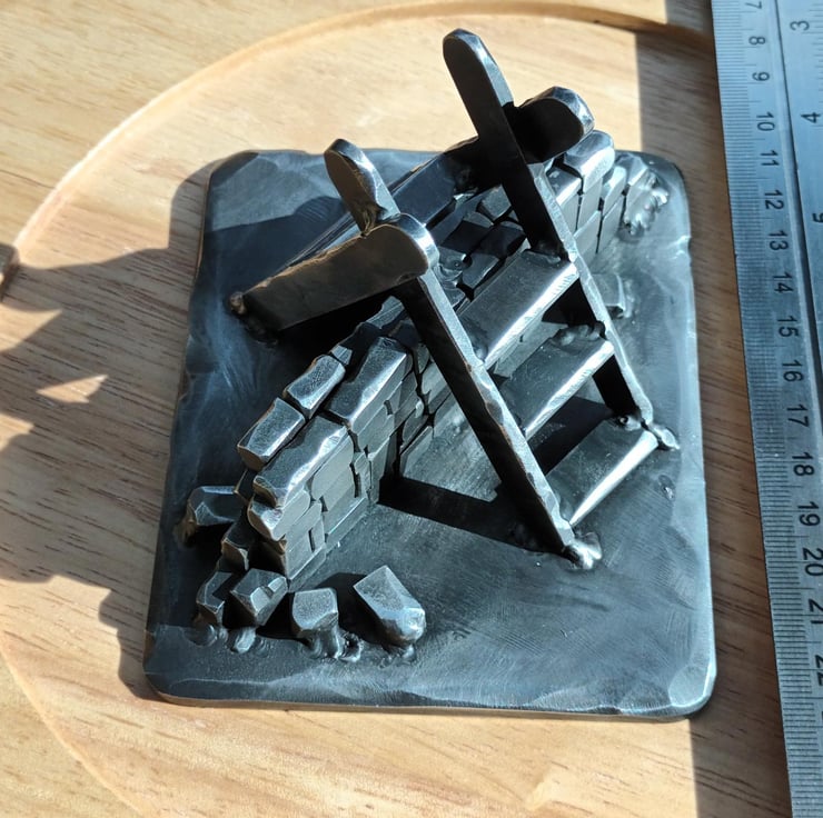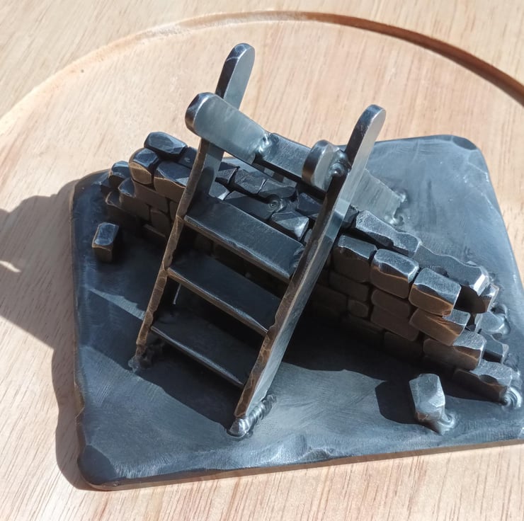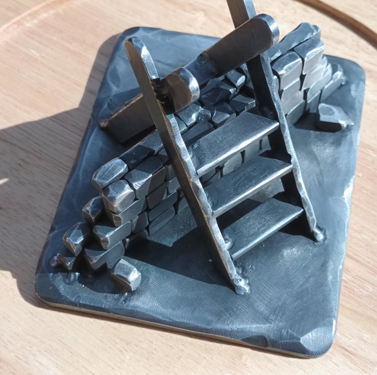 Dry Stone wall with ladder stile. Made from steel each piece is hand made and welded. approx 10cm x 8cm x 8cm 2kg. Numbered signed and logged 23.007 unique one off piece. heat treated and dipped in sealing oil then Lacquered with felt base. around 20 hours work in this piece.