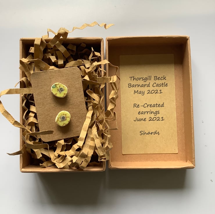 Hand crafted Jewellery and framed artworks using pre loved and discarded ceramics. Ceramic material will show signs of wear and damage. Entire process is a creative experience from discovery to final picture, nothing planned or preconceived. All materials personally collected from river banks, charity shops, roadside, woods, recycle centres, beaches, wherever dropped, dumped or donated ceramics are found, cleaned and shaped into new stories. Each piece comes with a short bio of where the ceramic came from, date found and re-created. Some shards collected are used as found, others are cut randomly which shape the final work. Every piece is individual, nothing replicated, however, due to repetitive patterns in ceramics there will be some similarity but only through the ceramic material not in the final piece.