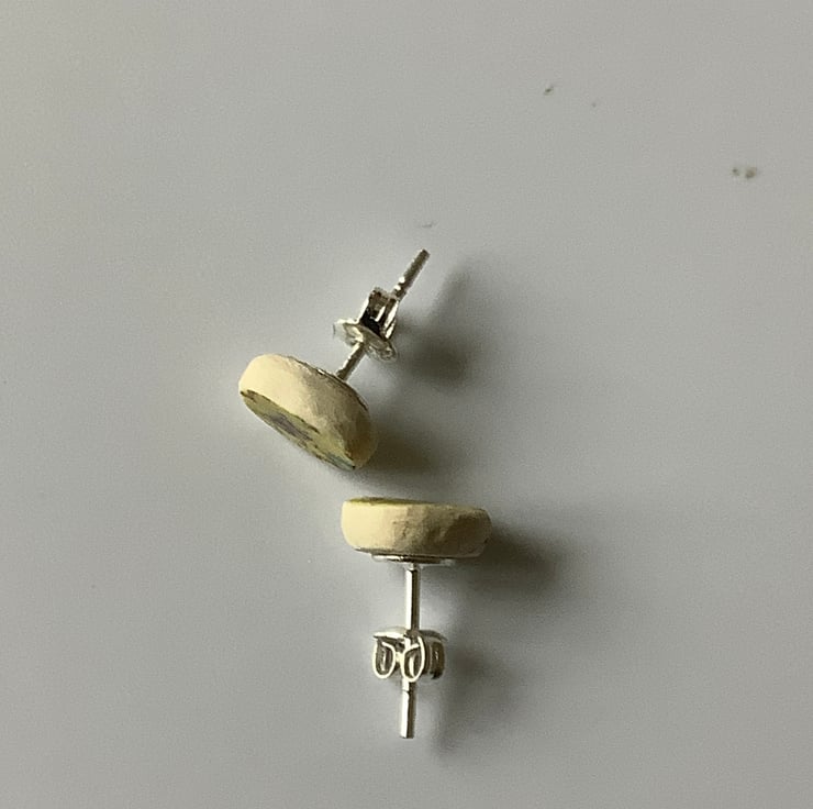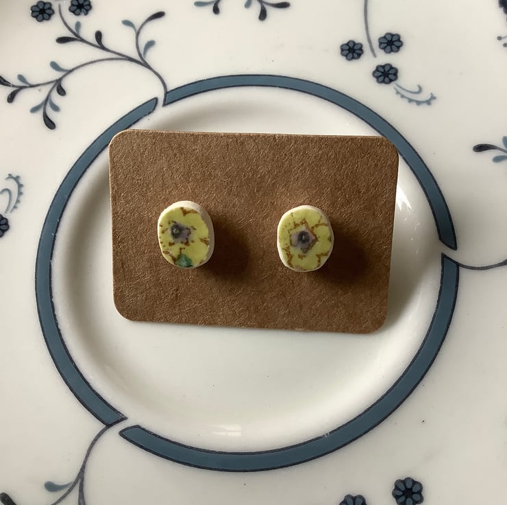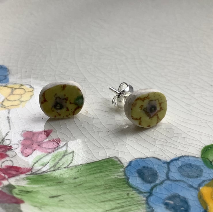 These earrings are made from a small fragment of ceramic found in the shallow water. Delicate yellow and blue pattern. Sanded edges and backs are finished with non toxic eco friendly matte sealant. One of a kind earrings.