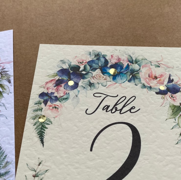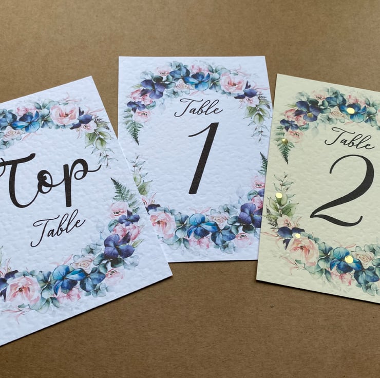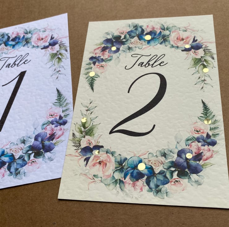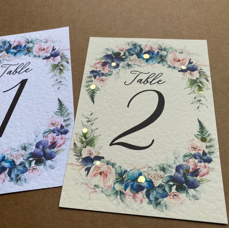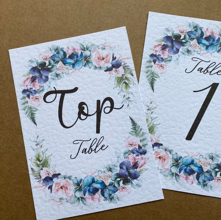 WEDDING table numbers, printed on A6 size cards. Navy blue flowers, blush pink roses and foliage wreath, rustic wedding theme design.