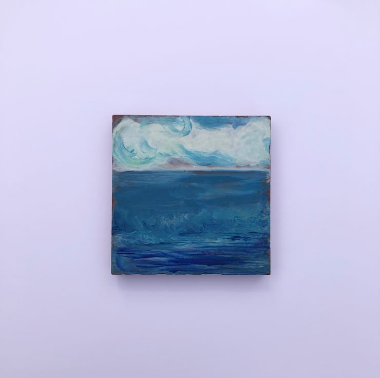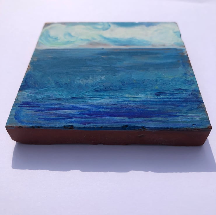 Seascape acrylic painting on a reclaimed terracotta tile. Wonderful mix of blues to show a view of the sea.