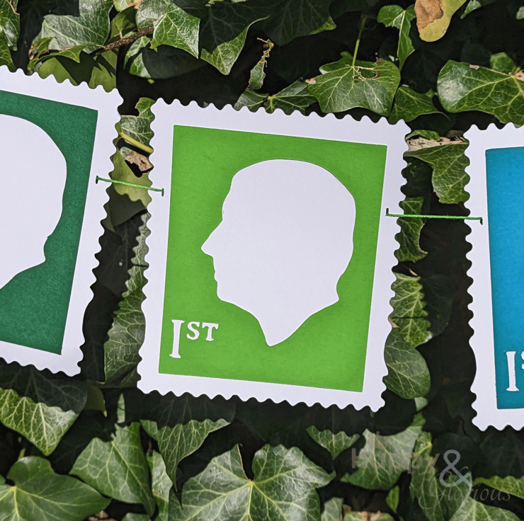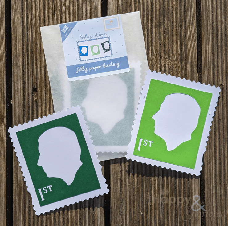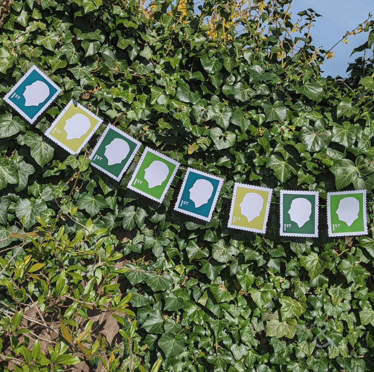 This postage stamp papercut bunting is designed and made by Happy & Glorious owner, Kate Tompsett. The postage stamps design is ideal for the King's Coronation, birthdays, anniversaries or parties, or just to make your home that little bit jollier! The postage stamps are different shades of green but get in touch if you need different colours.