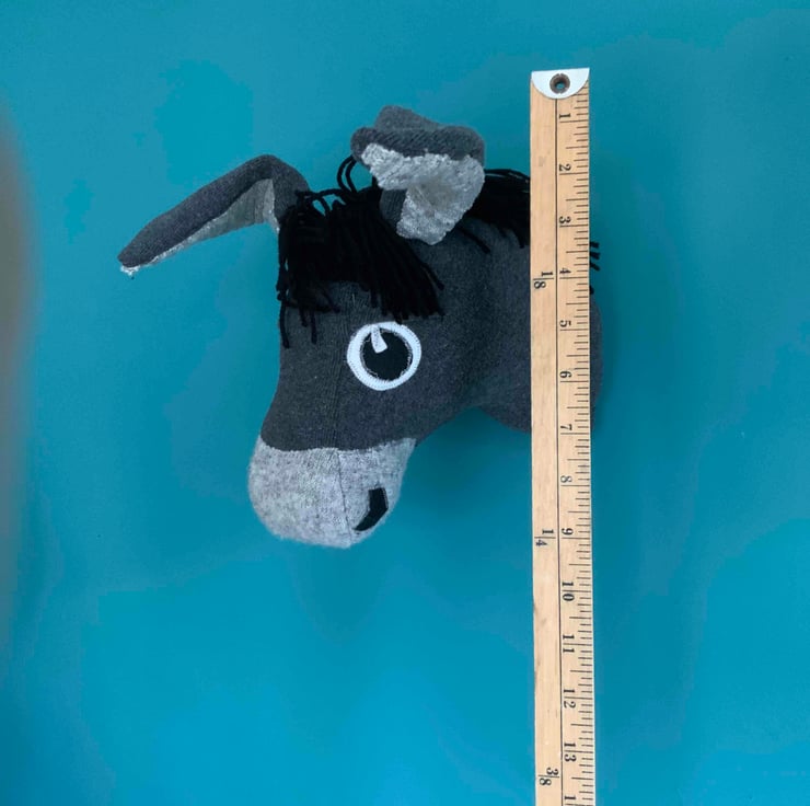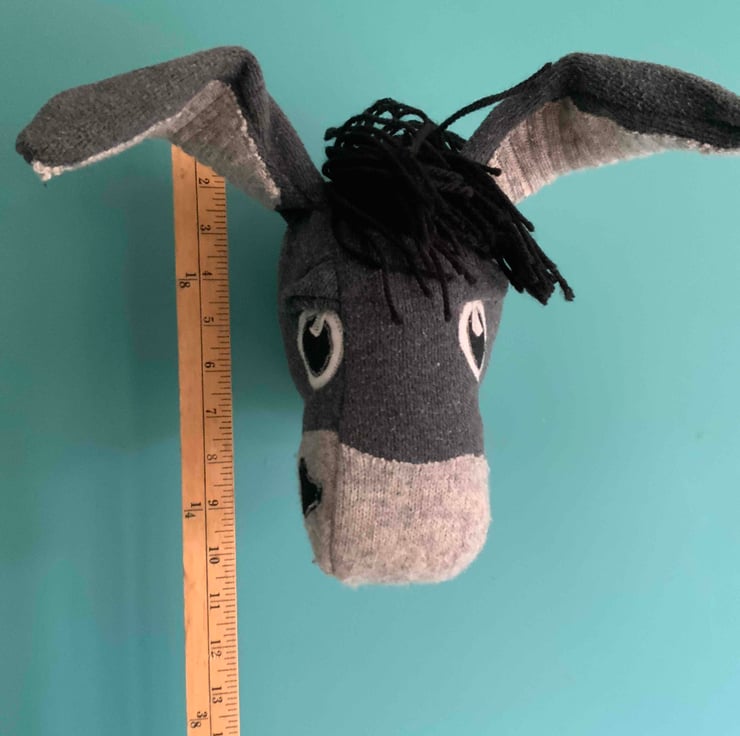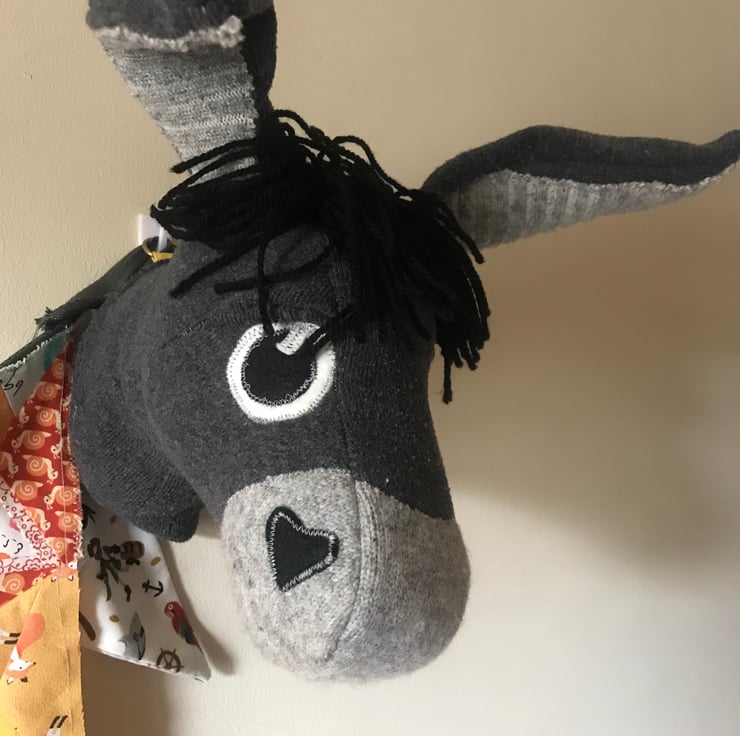Adopt your own seaside donkey wall head. Handmade on the East coast from recycling clothing, jumpers, felt and love. Each one is unique and has wired ears to make them even more characterful. Hours are spent rummaging around to find the fabrics perfect for these donkeys.