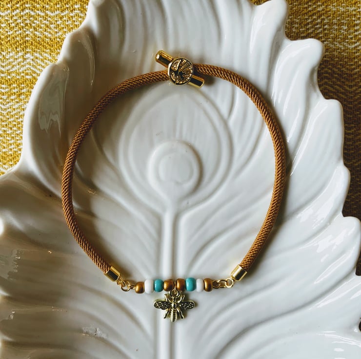 Featuring a gold colour bumble bee pendant charm centered between bright mini rochelle beads in blue,bronze and white. 11 cm long, 3 mm wide. This bracelet is suitable for older Children or young teenagers. Could fit an adult wrist if very slender. Very fashionable and on trend.