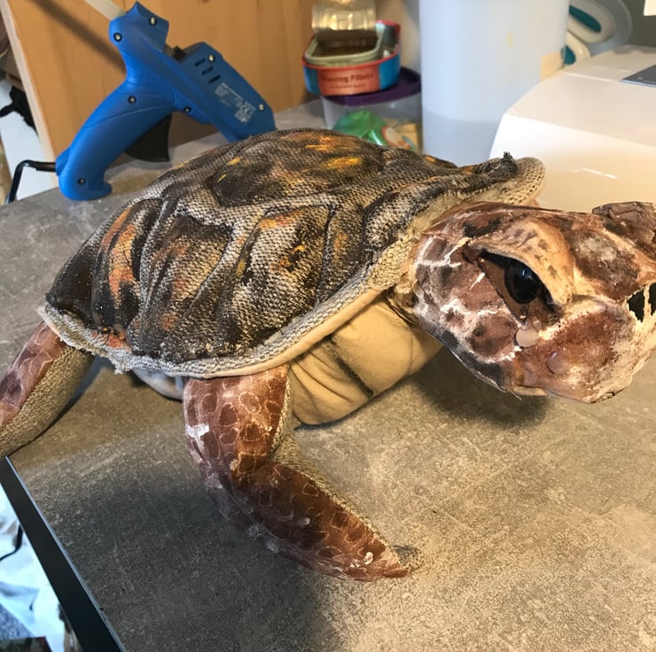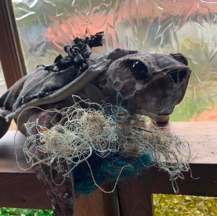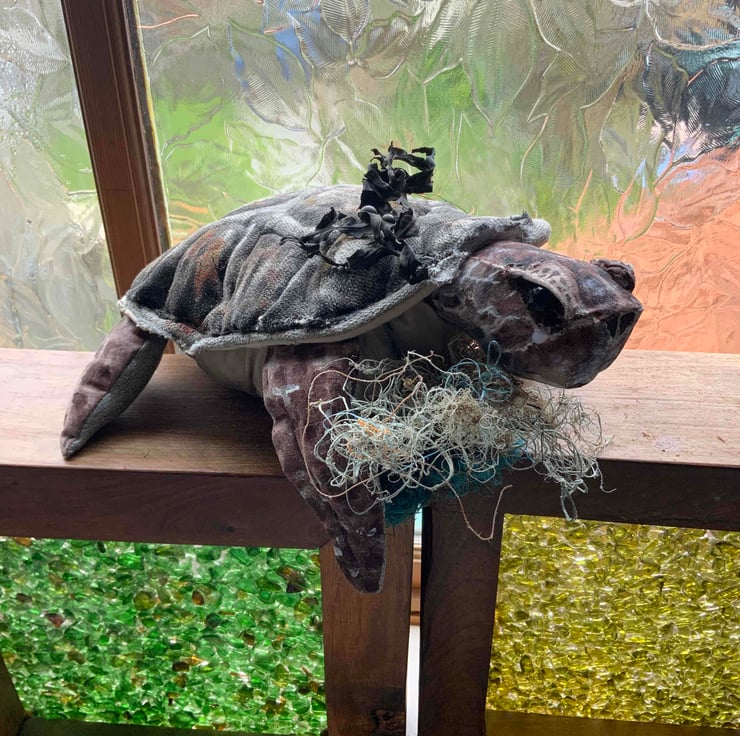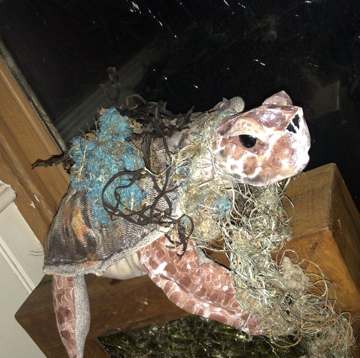 I live near the sea and constantly get upset by the rubbish on the beaches so made little little guy tangled in used fishing kit. He made from fabric, painted and has a little tear in his eye