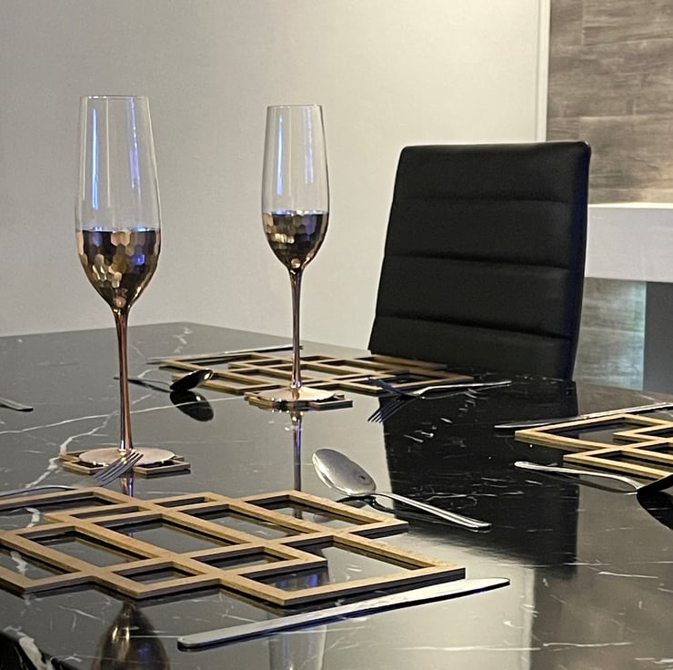 These Italian-inspired placemats and coasters are a great addition to any dining table, adding a touch of luxury and elegance. Made from FSC certified sustainable wood, they feature a stylish gold finish that is sure to impress your guests. The set includes four placemats and four coasters, each one laser cut and painted.