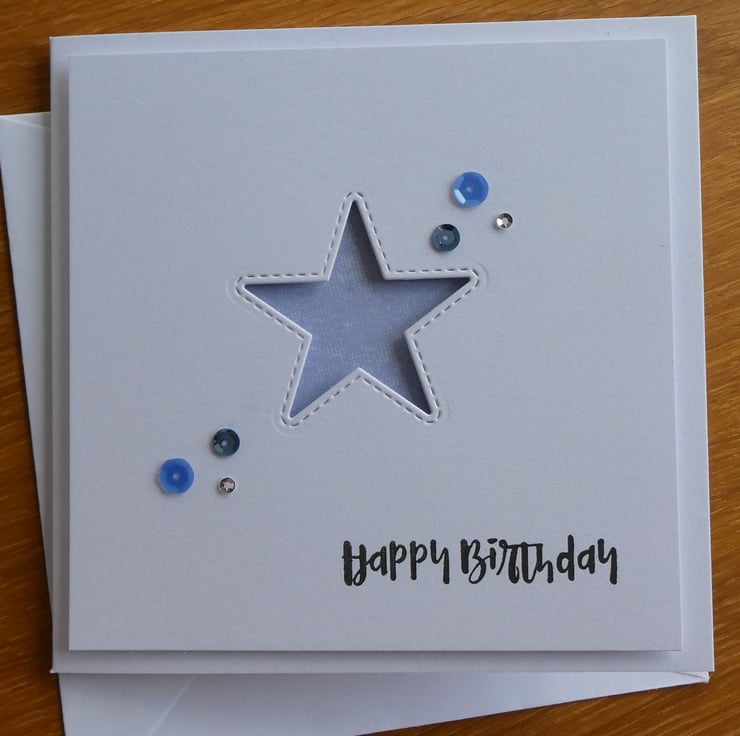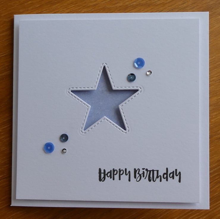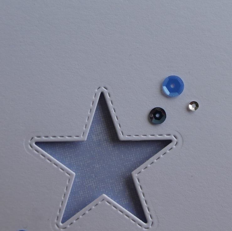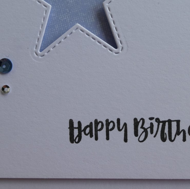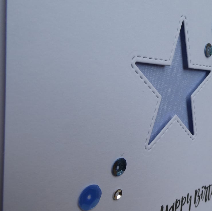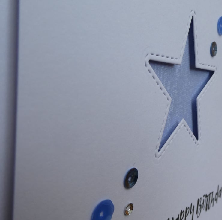 This birthday card for a star in your life has a pale blue textured effect background card which can be seen through a star shaped aperture.