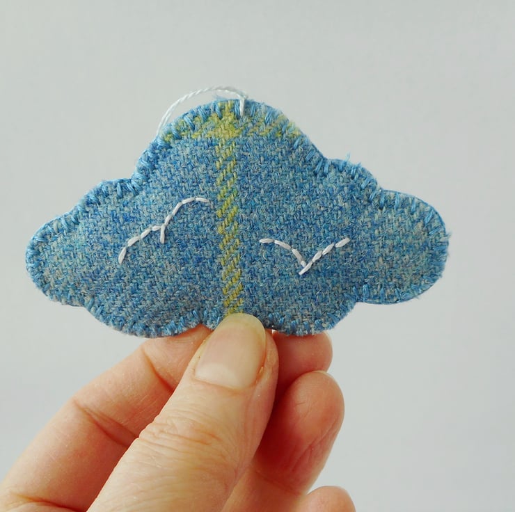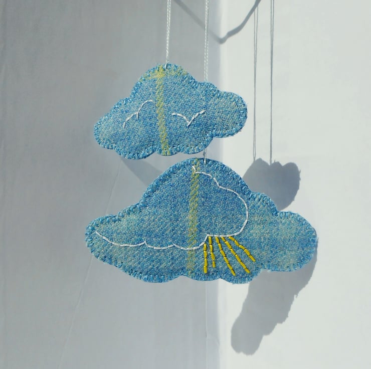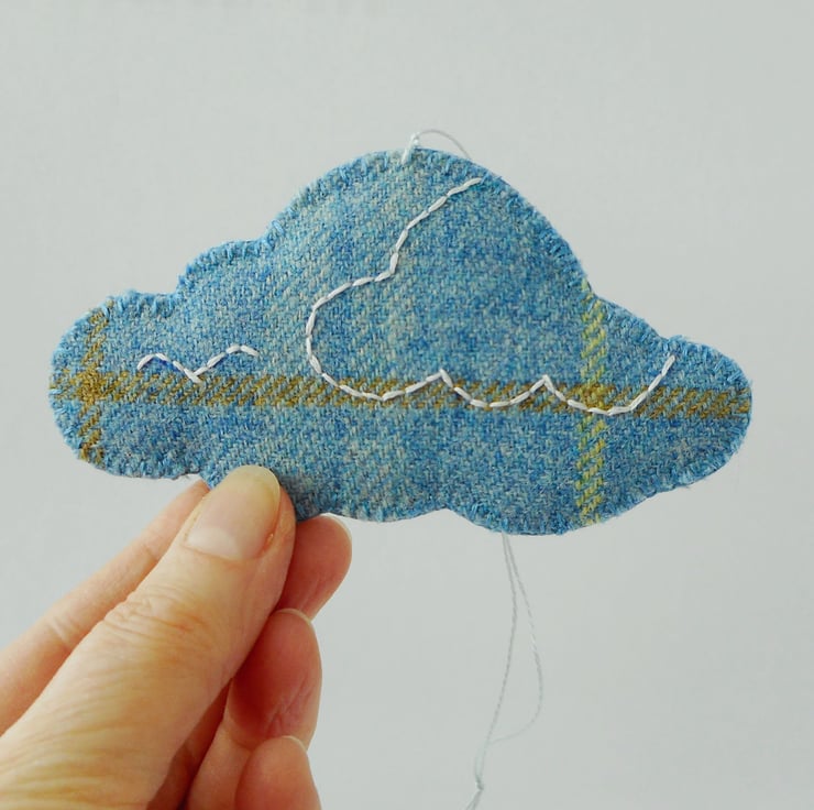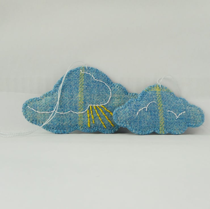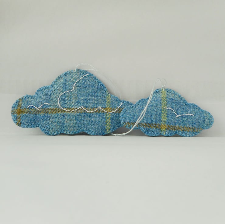 Set of 2 clouds in blue checked wool tweed with hand embroidered details.