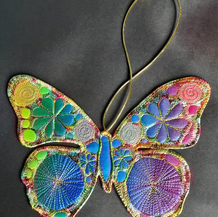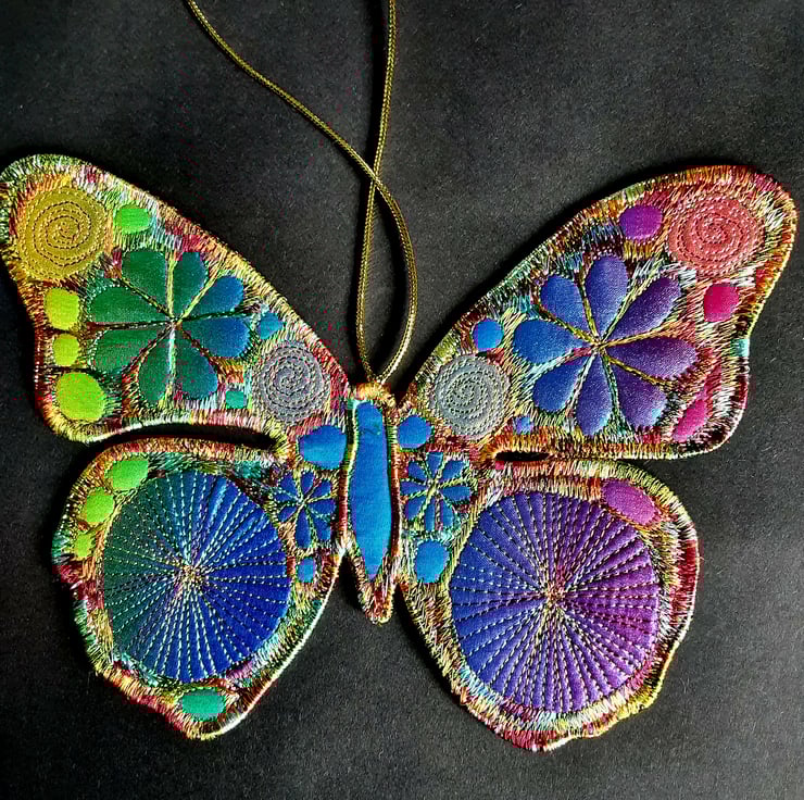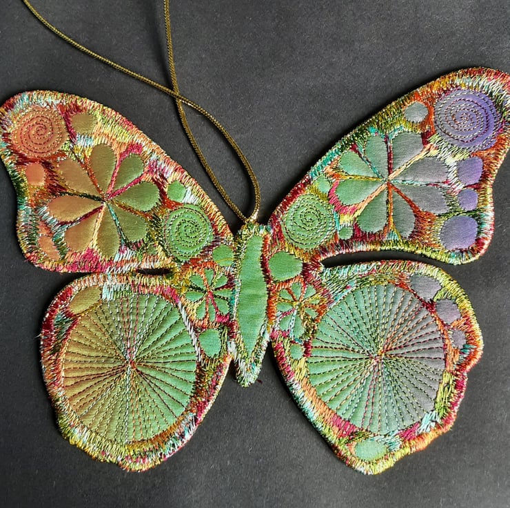 Made from layers of fabric including hand dyed Egyptian cotton and silk fabrics using the free machine embroidery style of sewing.